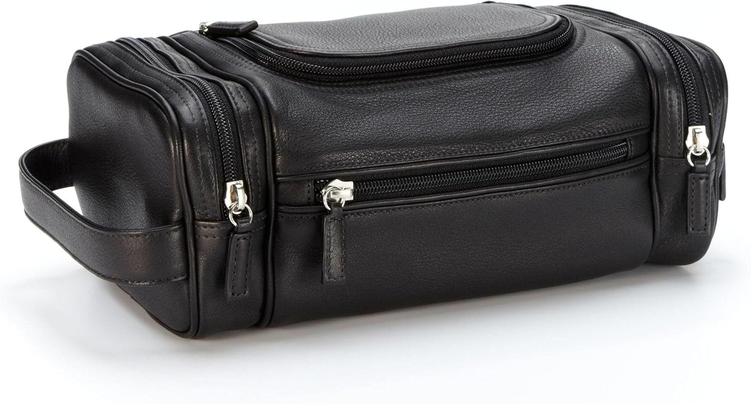 • Spacious compartments: The top zippered compartment is the largest and holds all your soaps and cologne. Two zippered compartments on either end of the bag are perfect for cuff links or other small accessories, while the front zippered pocket is ideal for the smallest needs like collar stays.