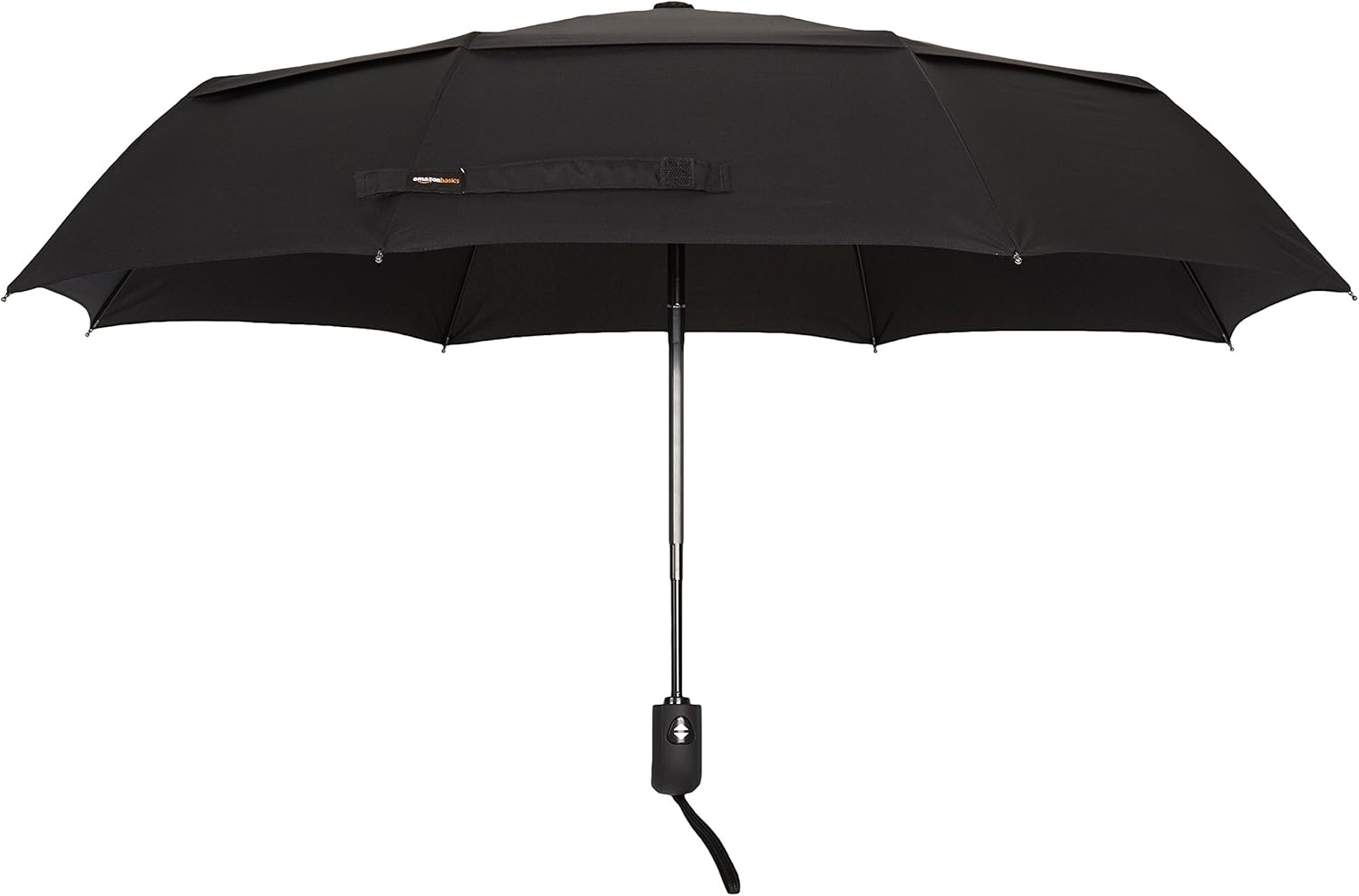 Amazon Basics Round Travel Umbrella for Rain, Wind-proof Compact Umbrella with Wind Vent, Auto Open/Close, Strong Alloy Steel Frame, Compact Size for Backpacks/Handbags (11" Long When Closed), One Size, Black