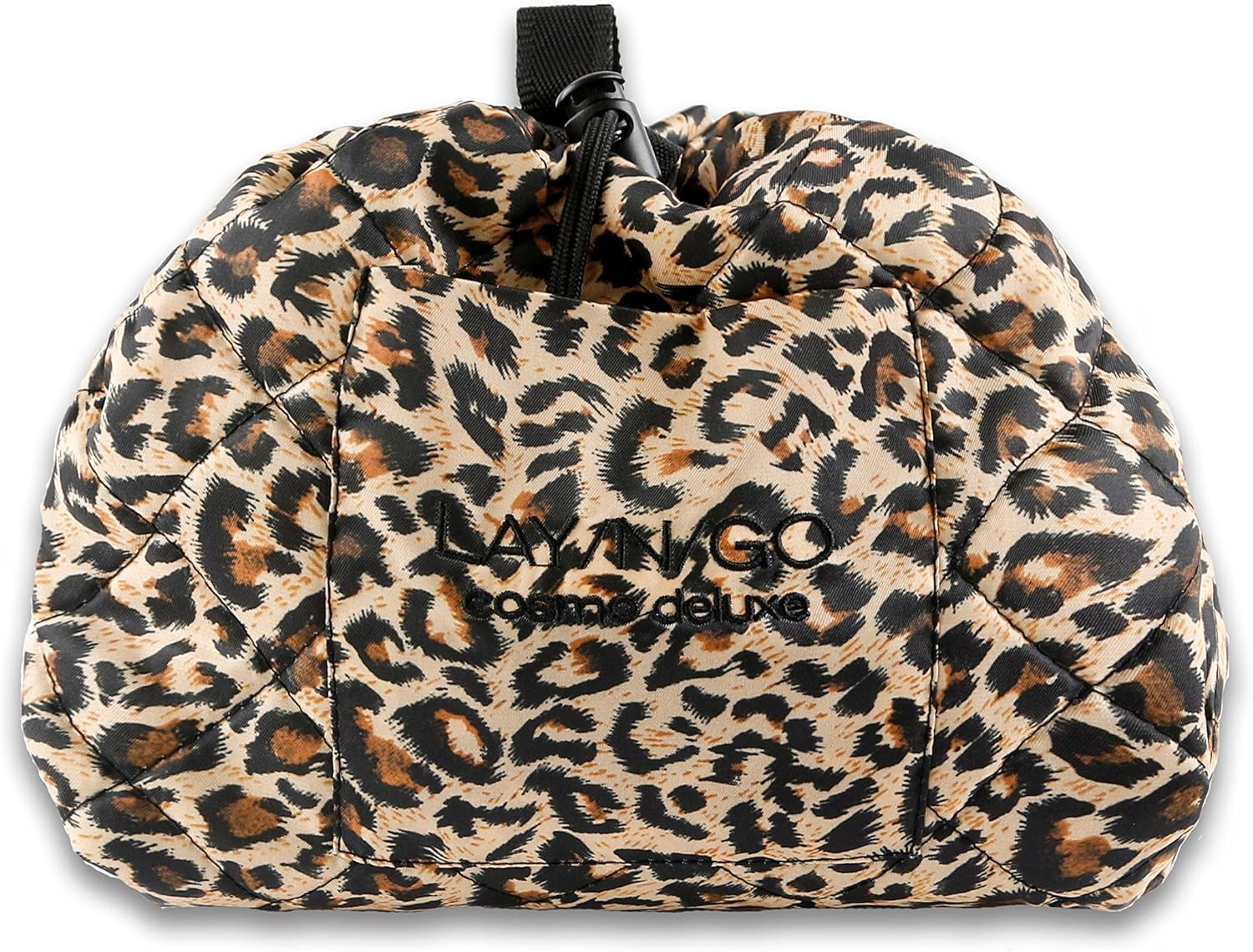 Lay-n-Go Cosmo Layflat Drawstring Cosmetic & Makeup Bag Organizer w/Zipper Pocket, Brush Loops & More, Cinch to Close, Lay Flat to Use, Durable, Machine Wash, Travel Toiletry Bag (22", Leopard)