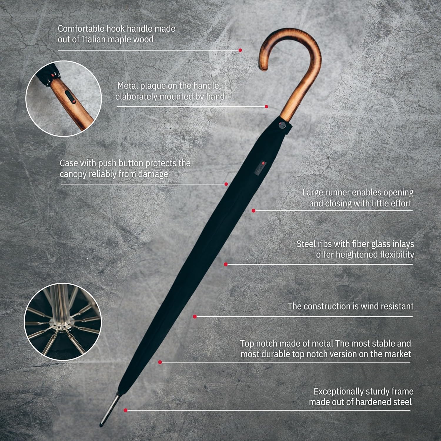• LUXURIOUSLY CRAFTEd TO PERFECTION. The Knirps S.770 is assembled in 31 meticulous steps using high-quality steel, eco+certified canopy fabric, and hand-finished maple wood—bringing classic umbrella craftsmanship into the modern world.