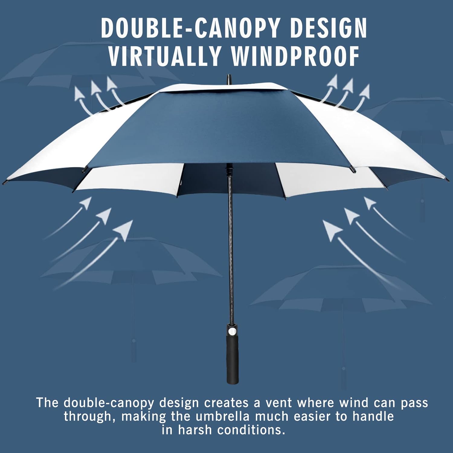• LARGE GOLF UMBRELLA WHICH IS WARM HAVEN The oversized golf umbrellas 62 inch is a haven for golf lovers,businessmen and daily travel.The golf umbrella windproof with a diameter of 135 cm can shield 1-3 people from the wind and rain.The warmth under the umbrella warms each other's shoulders