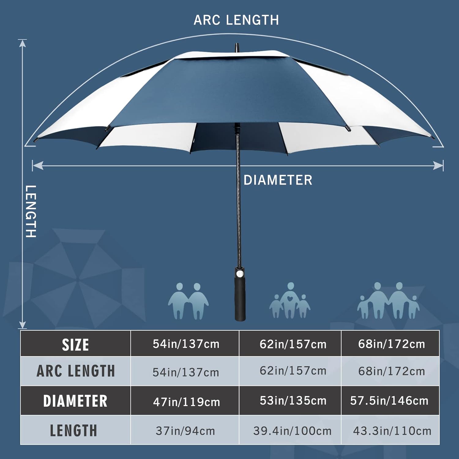 • LARGE GOLF UMBRELLA WHICH IS WARM HAVEN:The oversized golf umbrellas 68 inch is a haven for golf lovers,businessmen and daily travel.The golf umbrella windproof with a diameter of 146 cm can shield 1-3 people from the wind and rain.The warmth under the umbrella warms each other's shoulders