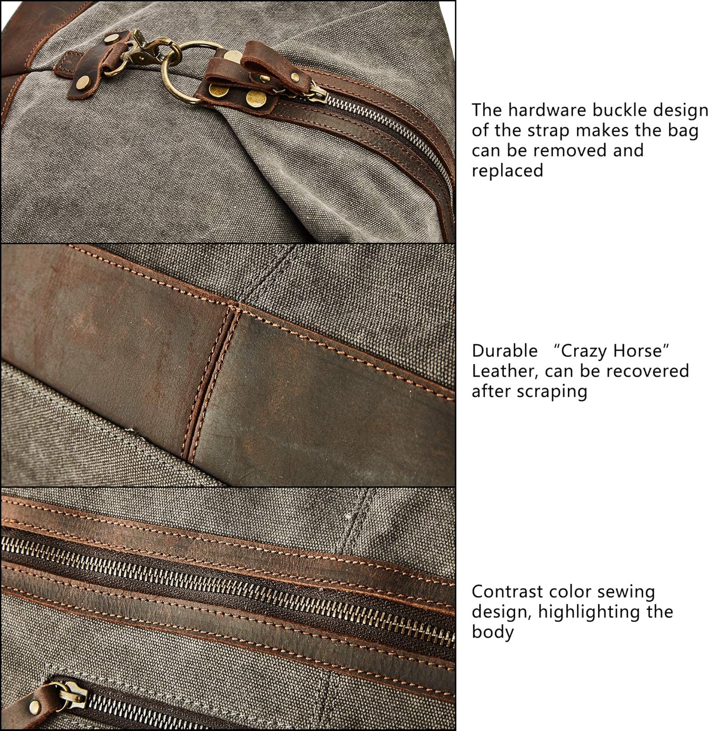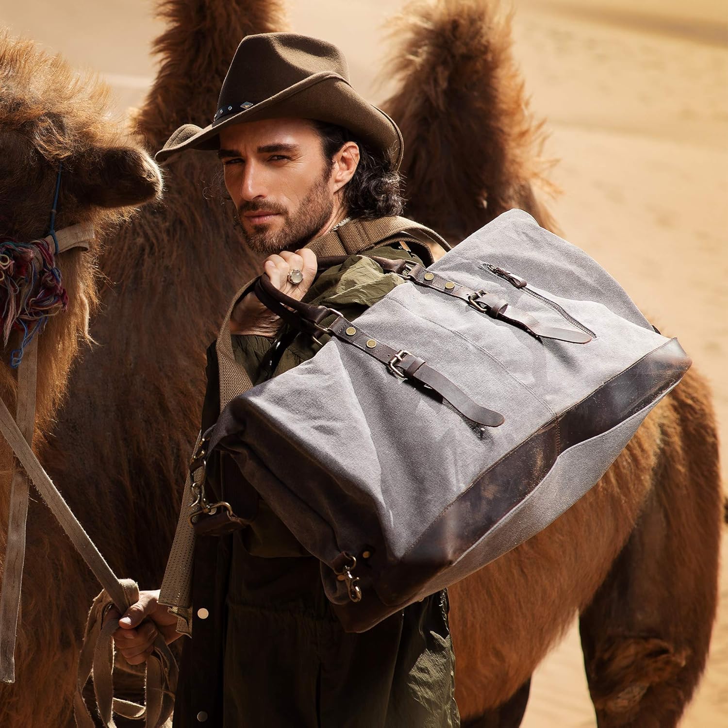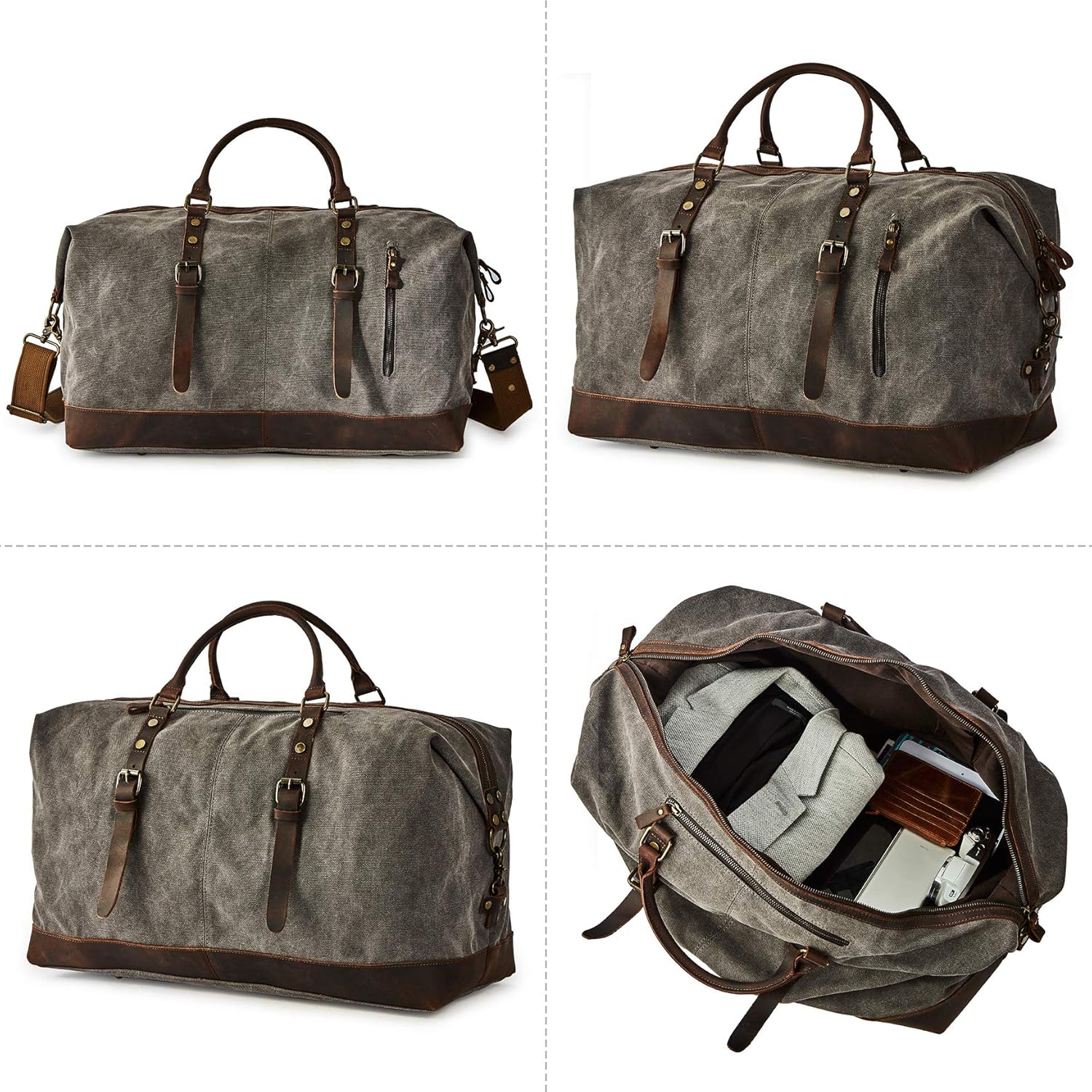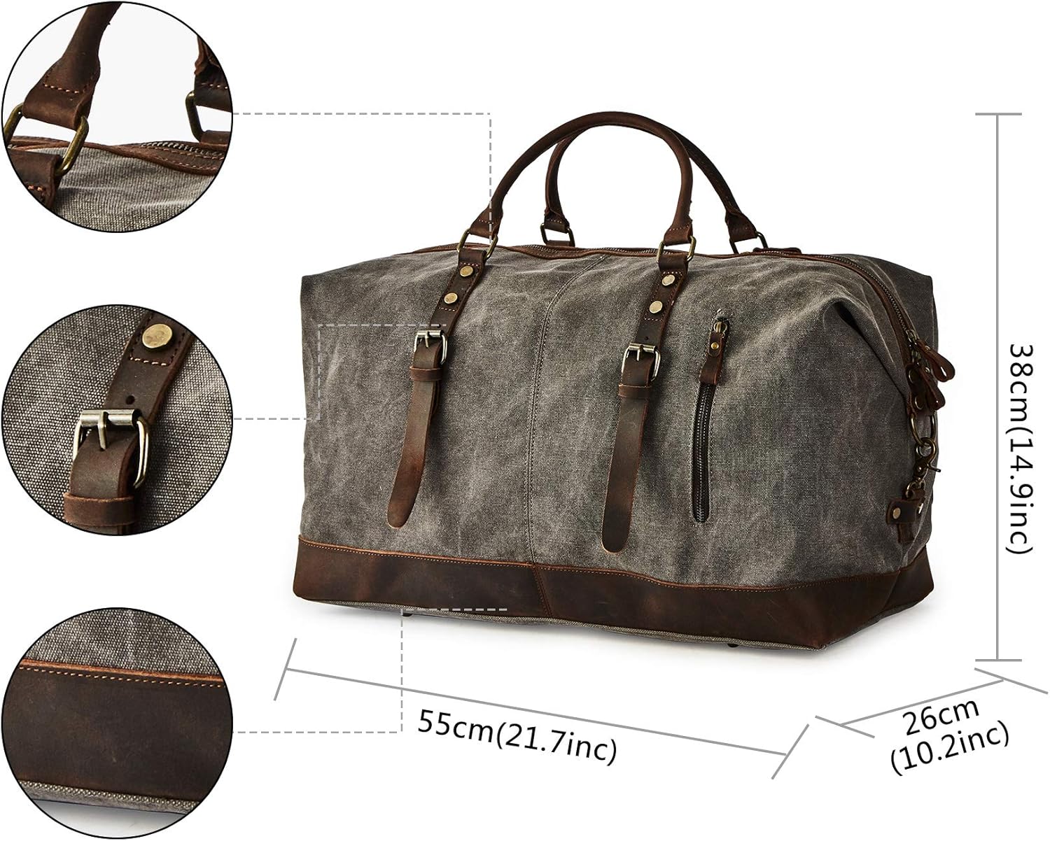 • 【Premium Quality Material】This duffel bag is made of waterproof durable canvas and top quality genuine crazy horse leather trim.The premium quality ensure the long lasting durability.The high density canvas is made of pure cotton, crafted with a tight double-knit weave,it's strong, hard-wearing, scratch-resistant. The crazy horse leather is made of high-end top layer cowhide material, with a thickness of 2.5mm, which is solid and durable.And the quality solid hardware won’t gather rust easily.