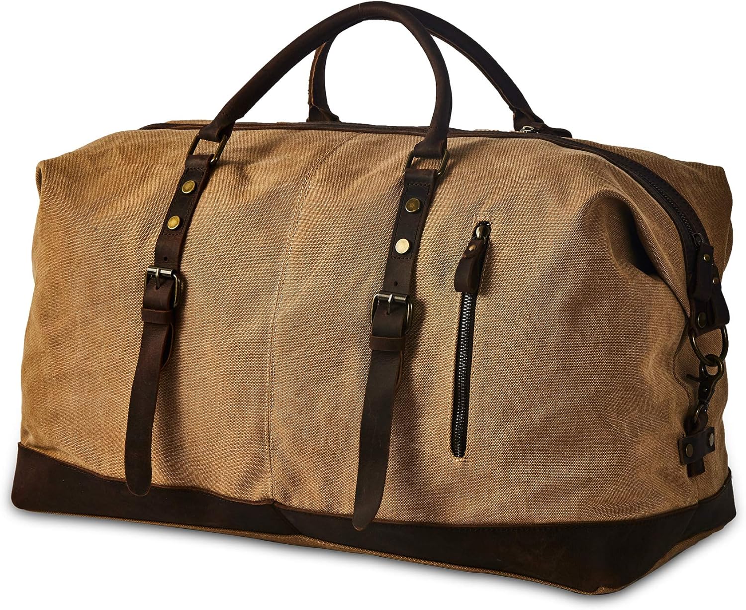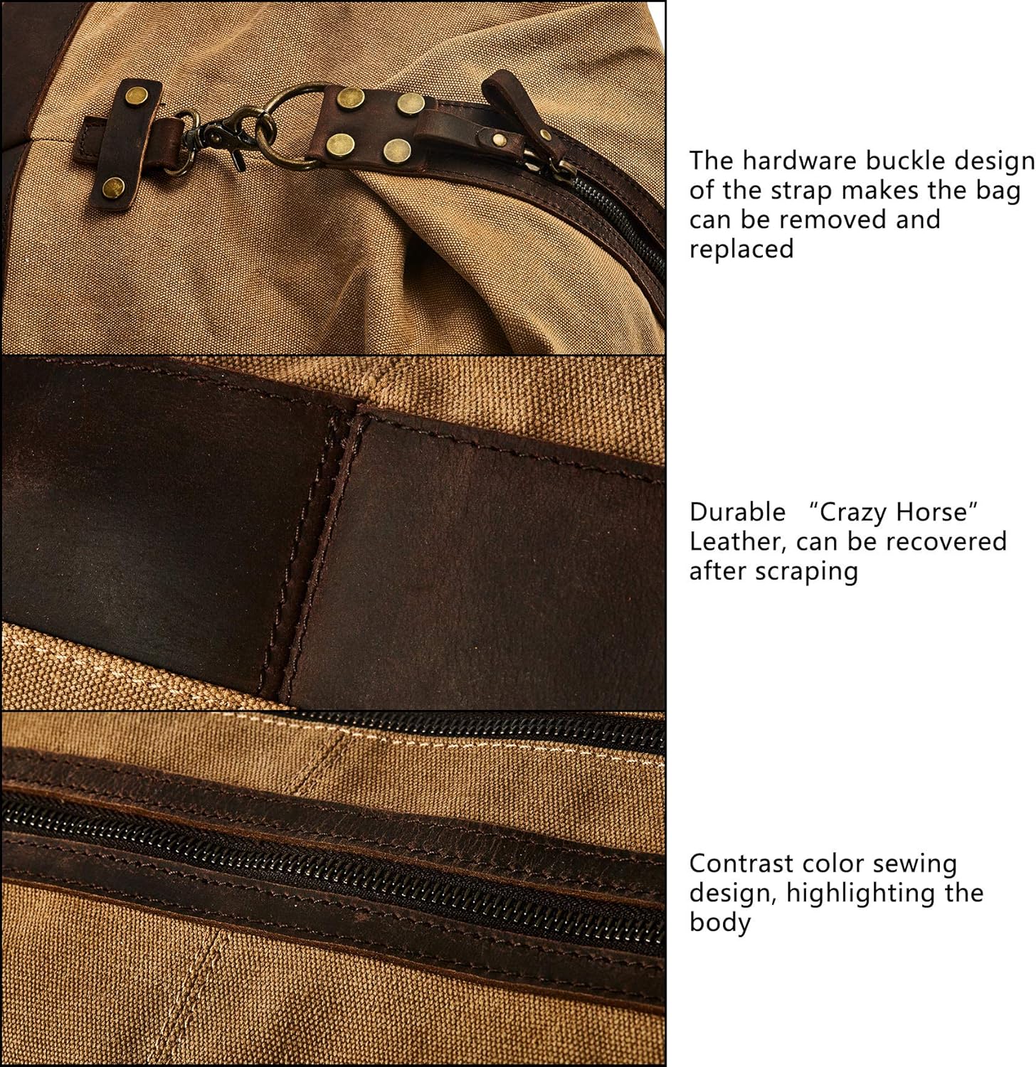 • 【Premium Quality Material】This duffel bag is made of waterproof durable canvas and top quality genuine crazy horse leather trim.The premium quality ensure the long lasting durability.The high density canvas is made of pure cotton, crafted with a tight double-knit weave,it's strong, hard-wearing, scratch-resistant. The crazy horse leather is made of high-end top layer cowhide material, with a thickness of 2.5mm, which is solid and durable.And the quality solid hardware won’t gather rust easily.