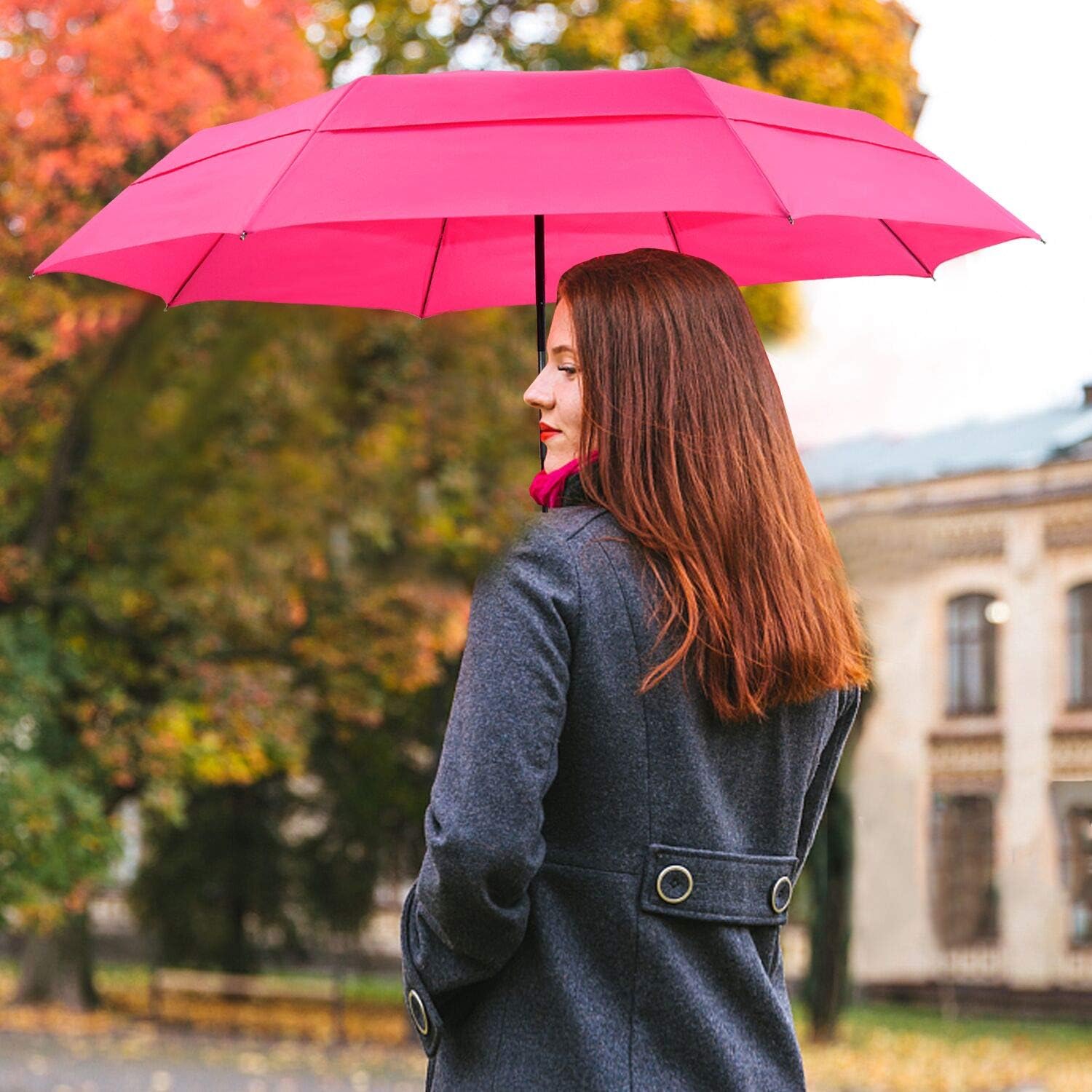 • Windproof and Sturdy : This 54in large umbrella with vented Double Canopy construction allows the wind to pass through the vents preventing it turning inside out. Fiberglass and stainless steel frame system cries out NO rust, NO breaking