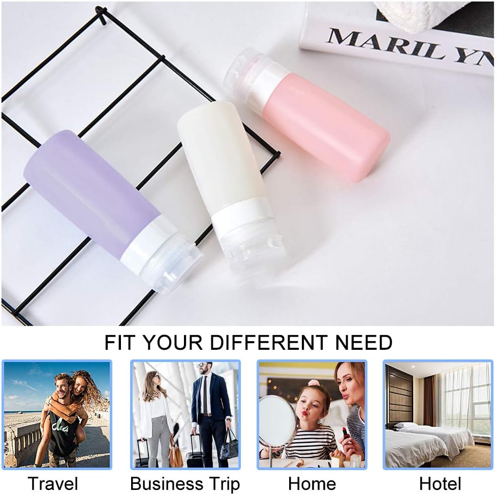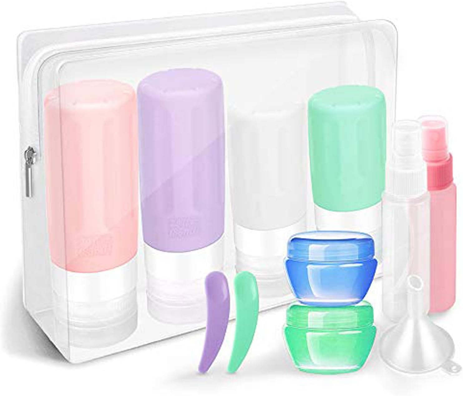 • 【Best Travel Accessories】: Travel Bottles Pack of 12 Products: 2 Silicone Bottles (3oz/85ml), 2 Silicone Bottles (2oz/65ml), 2 Spray Bottles (1.7oz/50ml), 2 Cream Jars(0.4oz/12ml), 2 Spatulas, 1 Funnel, 1 Toiletry Bag,Multiple Colors and Types of Travel Size Accessories to Meet Your Various Needs.