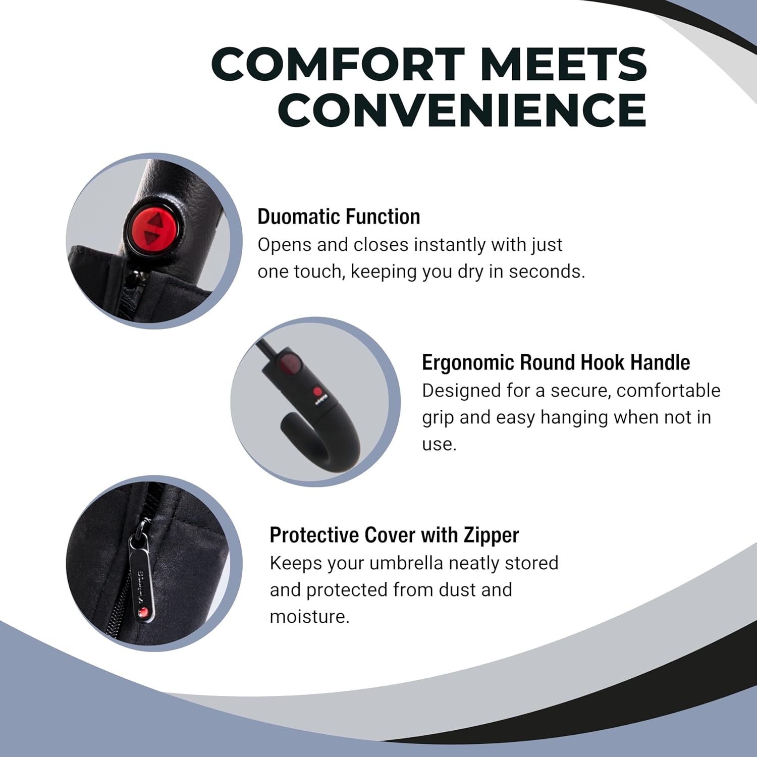 • Duomatic One-Touch Operation – Advanced push-button system deploys or retracts the canopy in seconds—no tugging or twisting required. Seamless open/close lets you slip through doors, cars, and subway turnstiles without missing a beat when weather shifts suddenly.