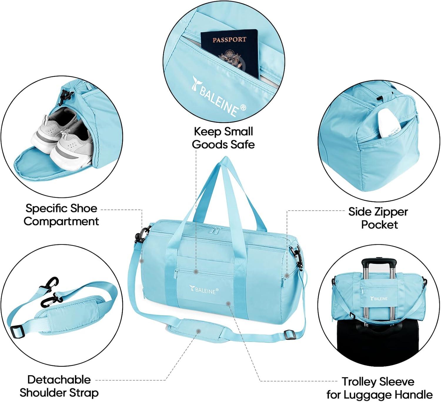BALEINE Gym Duffel Bag for Women and Men, Small for Sports, Gyms and Weekend Getaway, Waterproof Dufflebag with Shoe and Wet Clothes Compartments, Lightweight Carryon Gymbag (Azure)