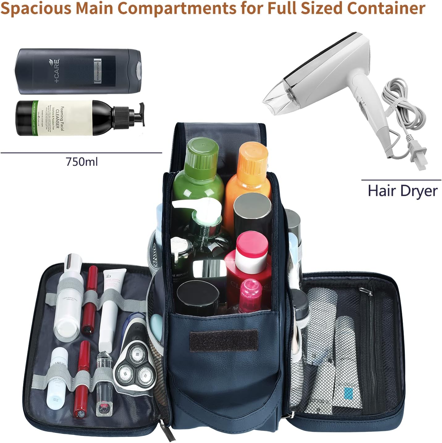 • HANDY DESIGN FEATURES: Crafted with your comfort and ease in consideration, this travel toiletry bag equipped with a leather handle, making it easy to carry and grab. Inside, elastic straps keep bottles upright and secure, preventing spills. The double zipper compartment allows quick access, even without fully opening the bag.it's an ideal companion for both business trips and vacations, effortlessly merging functionality with style, suitable for both men and women
