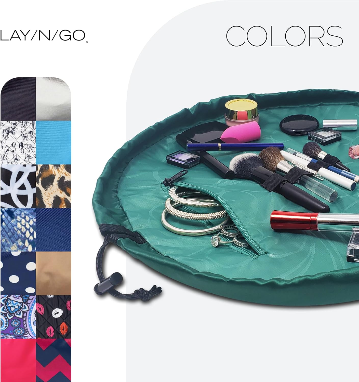 Lay-n-Go Cosmo Lay Flat Drawstring Cosmetic & Makeup Bag Organizer - Zipper Pocket, Brush Loops & More - Durable, Machine Washable Toiletry Carrier for Travel, Cinch Closure, Gift (20", Evergreen)