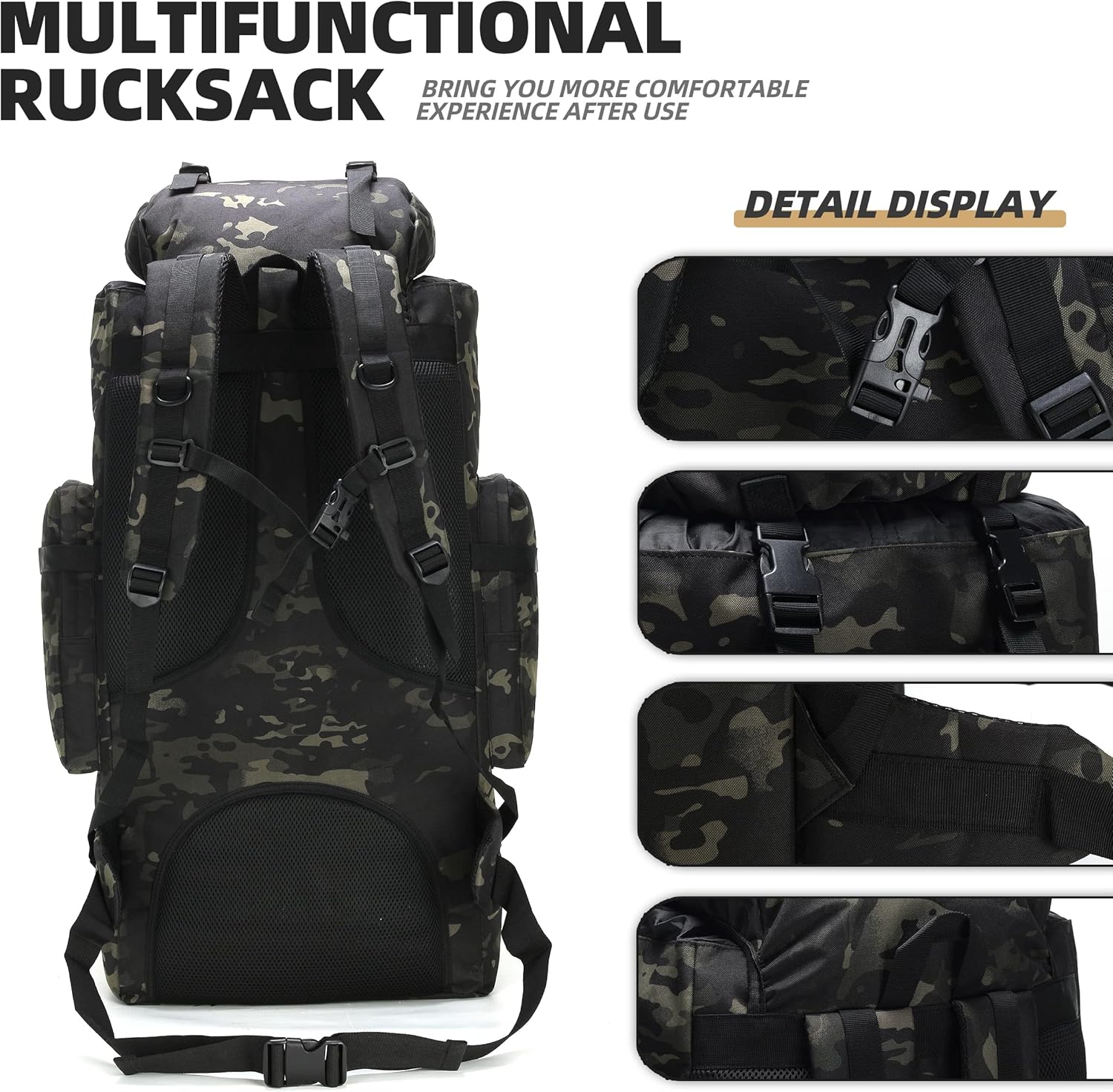 • 【Separate Belt Bag 】100l molle pack has an independent belt bag that can be used as a shoulder bag or messenger bag.It is very convenient to carry, you can store some things you need at any time,like water,flashlight ,Cell phone,Headphones,sunglasses,etc.