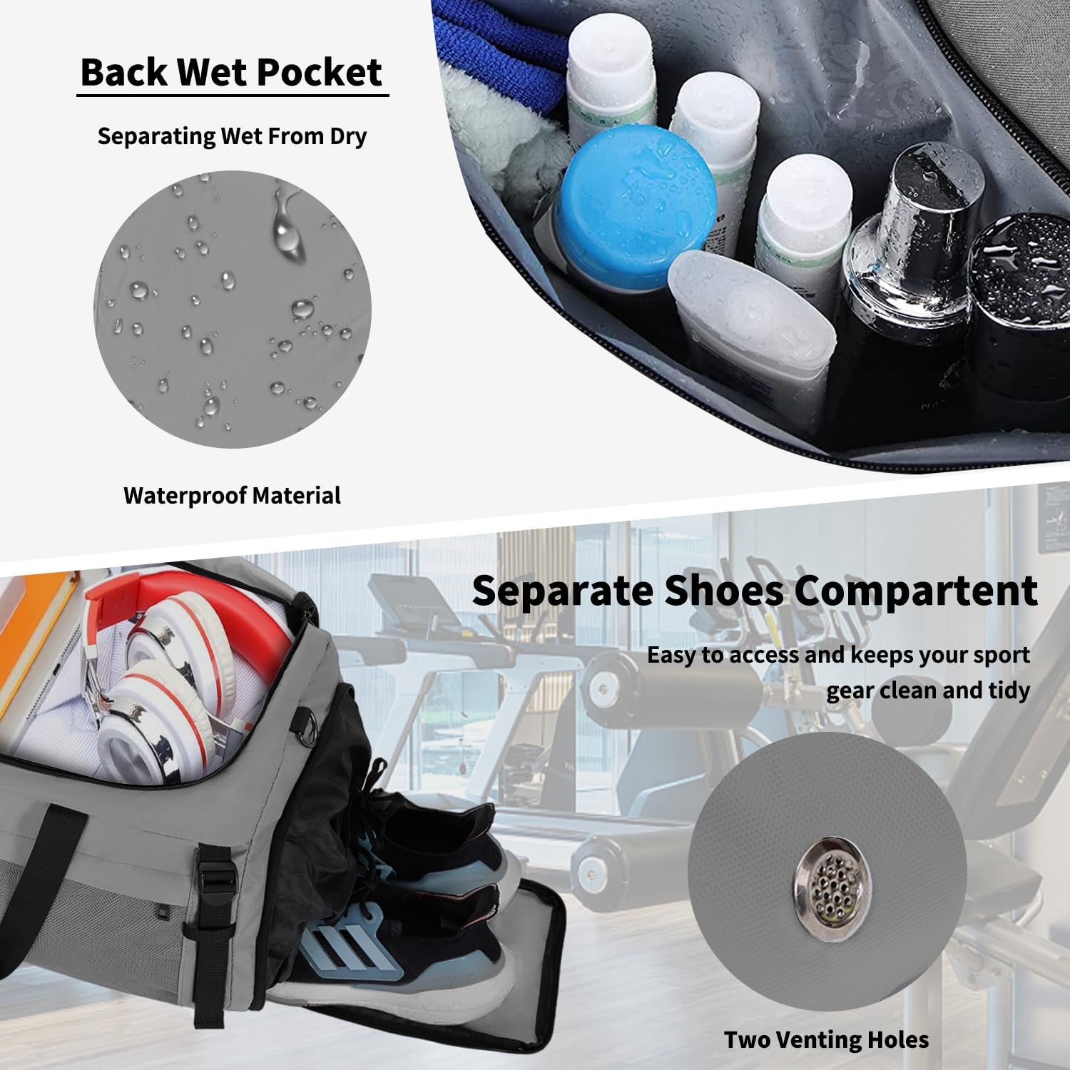 Eackrola Large Sports Gym Bag, Travel Duffel bag with Wet Pocket & Shoes Compartment for men women, 65L, Lightweight(Light Gray)