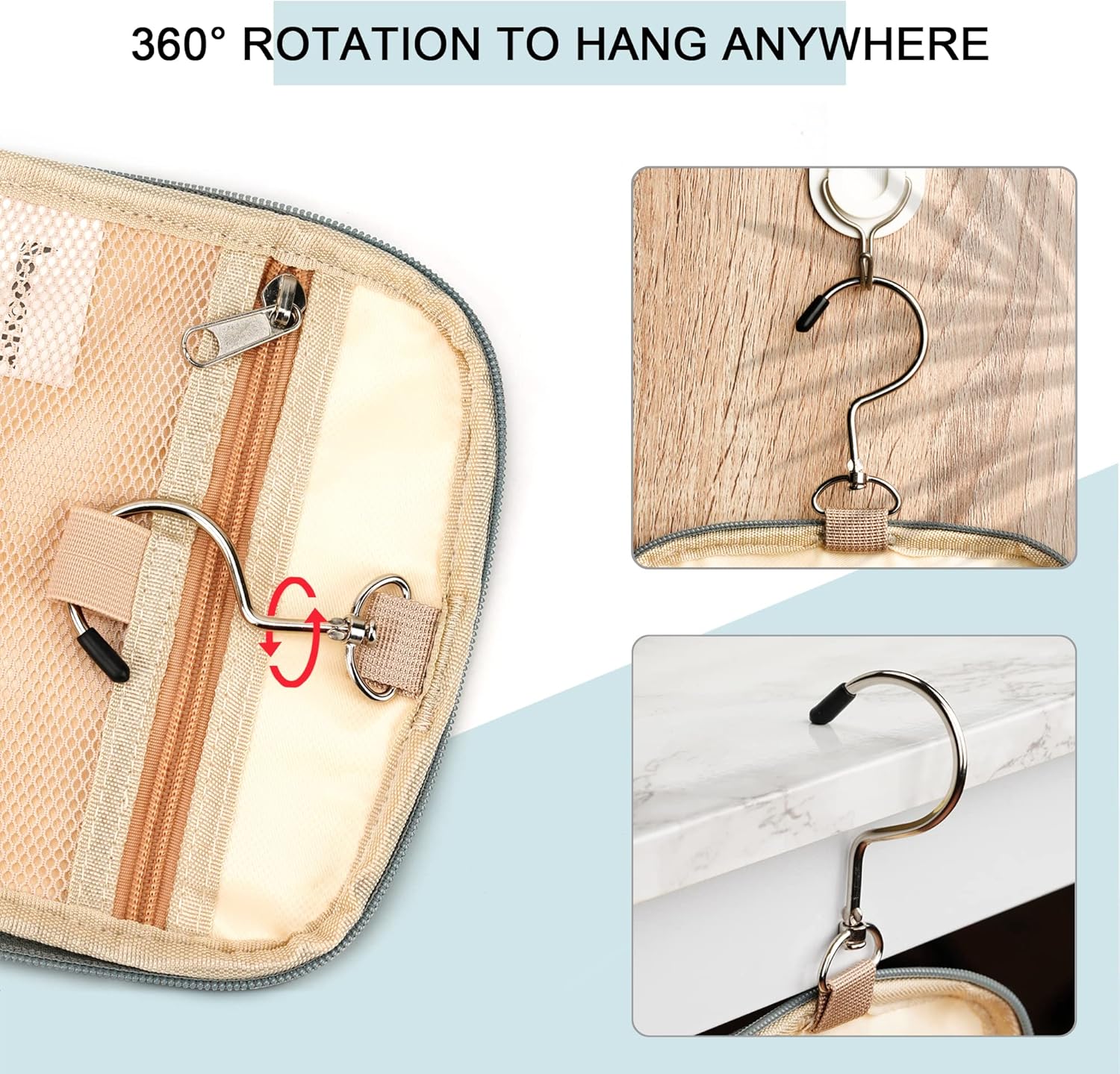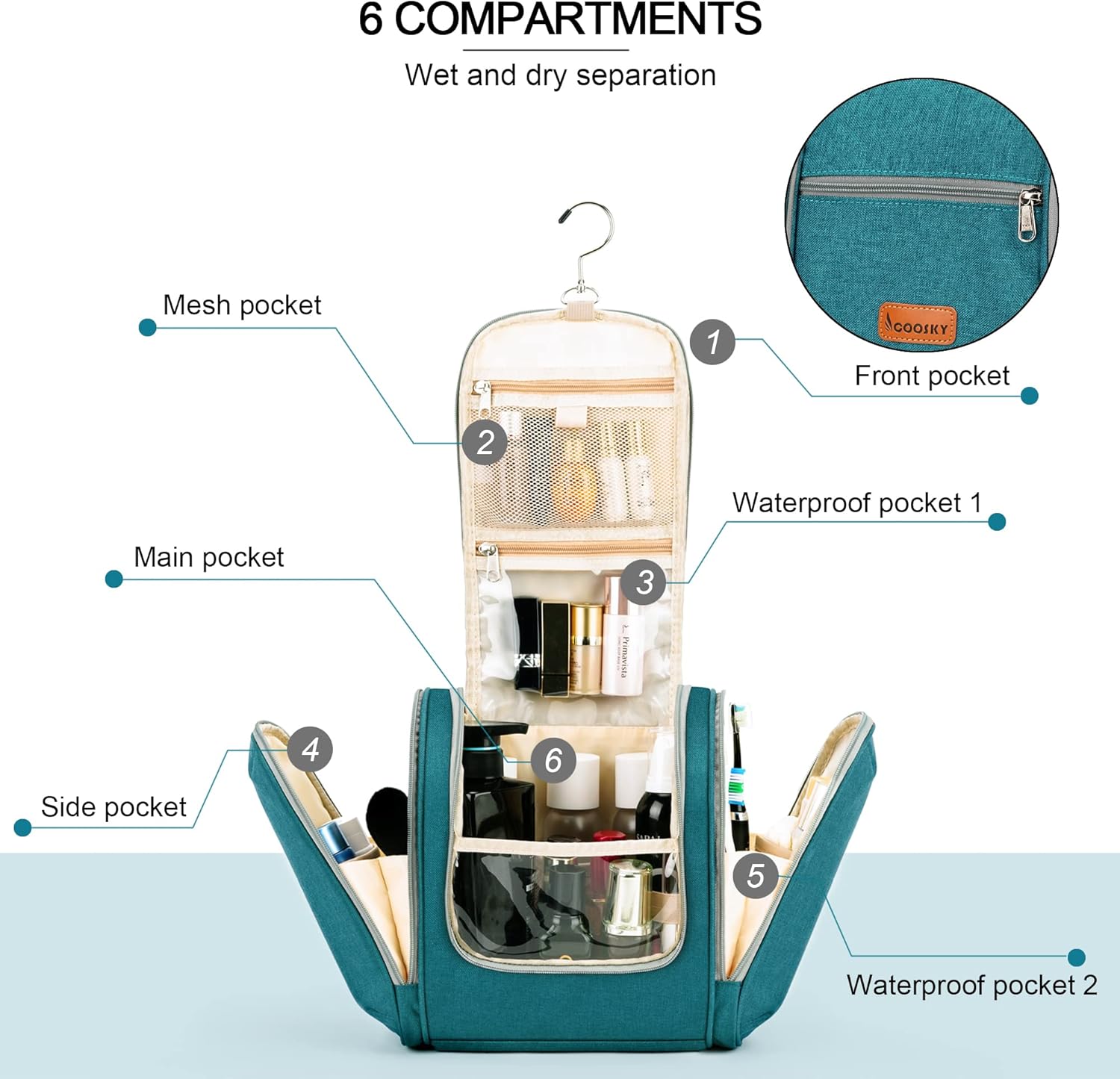 • ONSIDERABLE DESIGN - The elastic band and elastic mesh bag in the main compartment and two side compartments can keep the bottle fixed and upright. It has two waterproof compartments specially used for storing wet items. You can put your wet towel, toothbrush, shaving kit, and leaky cosmetics in it. The 360 degrees rotate metal hook gives you a variety of hanging options.