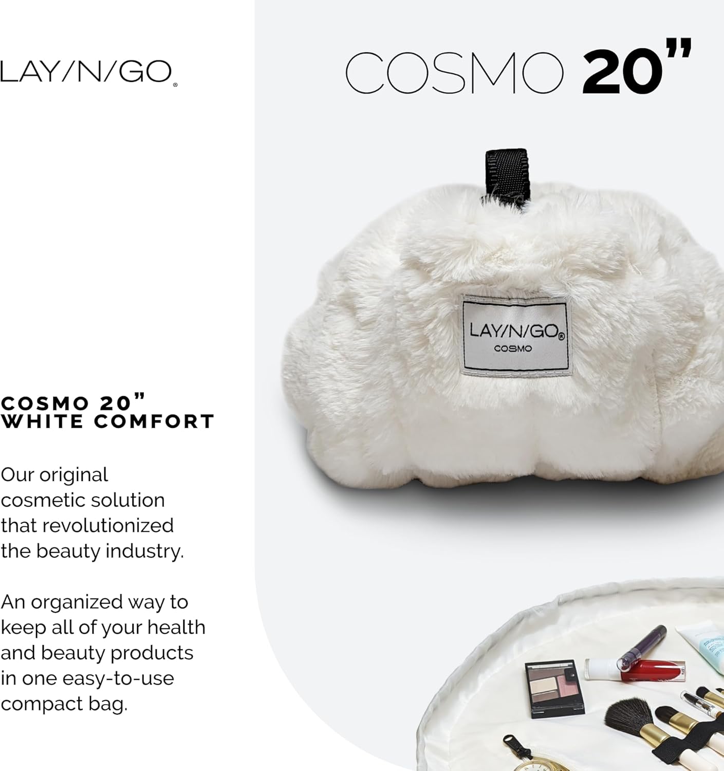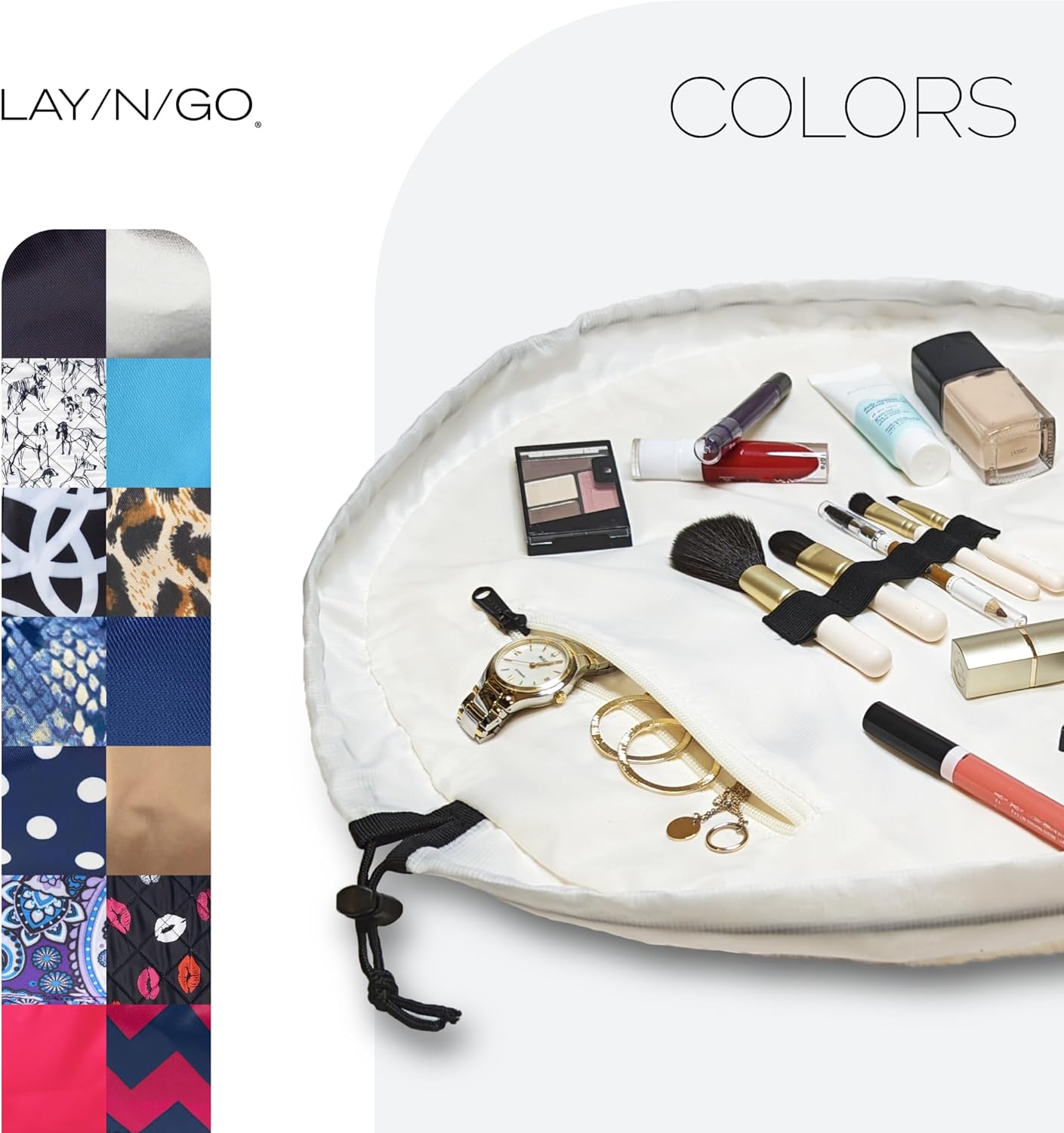 Lay-n-Go Cosmo Drawstring Cosmetic & Makeup Bag Organizer - Portable Drawstring Makeup Bag w/Zipper Pocket, Makeup Loops & More - Durable, Machine Washable Toiletry Bag (20", Comfort/White)