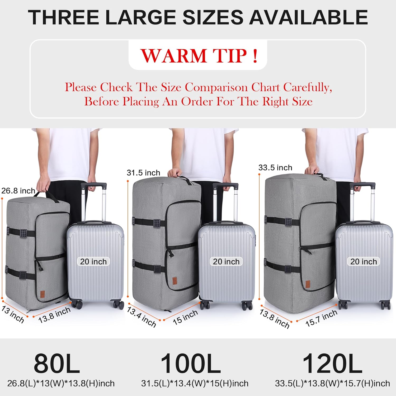 • [ 120L Extra Large Duffle Bag ] : With a generous capacity of 120 liters, this duffle bag is roomy enough to hold the belongings of a family of 4 people for 5-7 days of travel. It weighs about 85% less than your empty suitcase, but can also provide the same solid package. Say goodbye to bulky, hard-to-store luggage and hello to the convenience of a collapsible duffle bag.