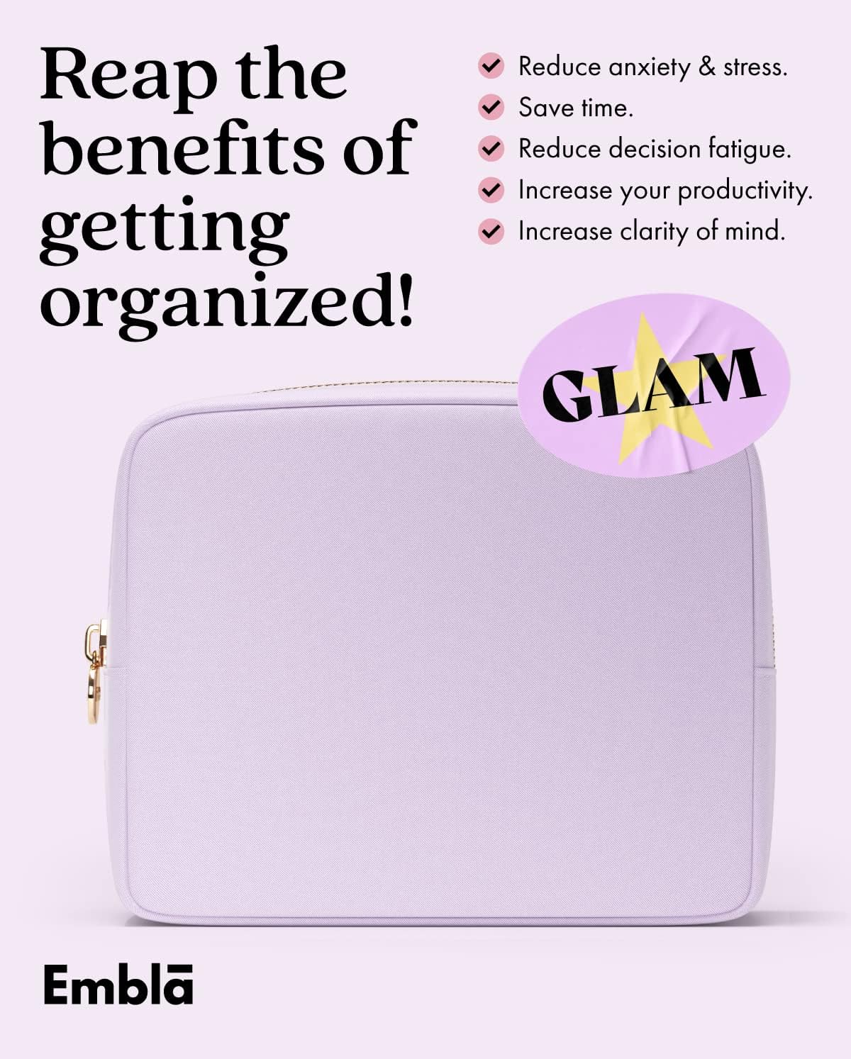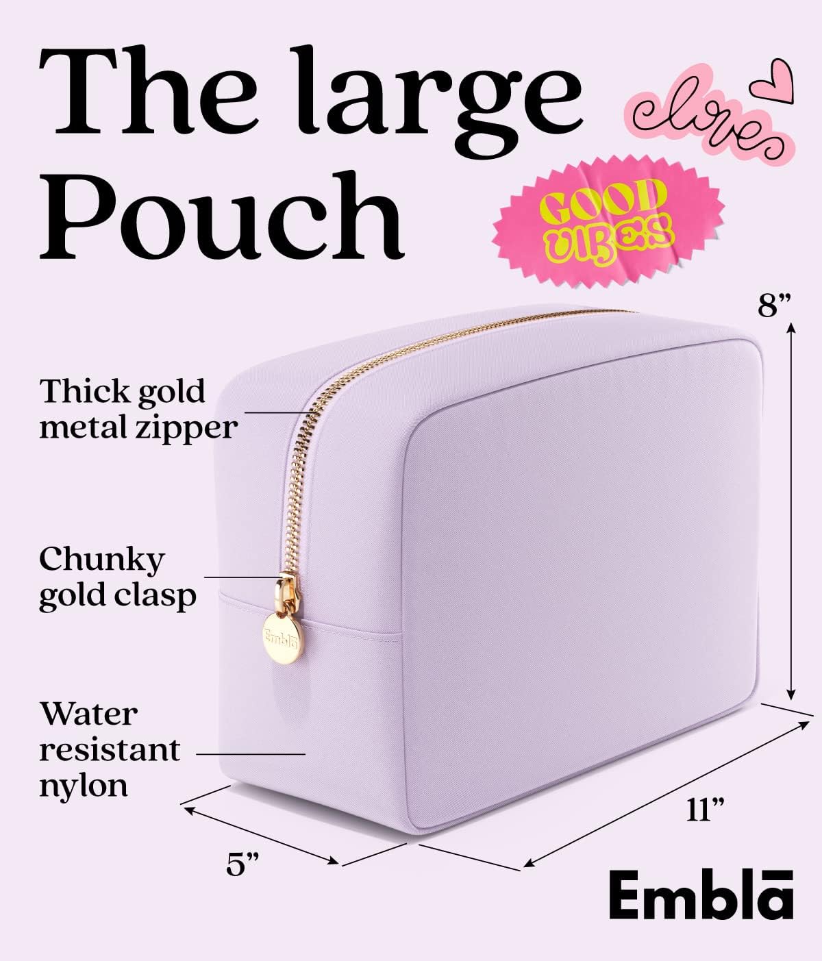 • TRAVEL + CUTE = EMBLA! - Our bags are THE trendy & preppy storage gifts! Simply pick your size (Mini, Large or XL) and start organizing all of your makeup, lipstick, hair stuff, snacks and jewelry accessories! Or use it as a clutch handbag, makeup brush holder, skin care bag, zippered carry case or coin purse wallet!