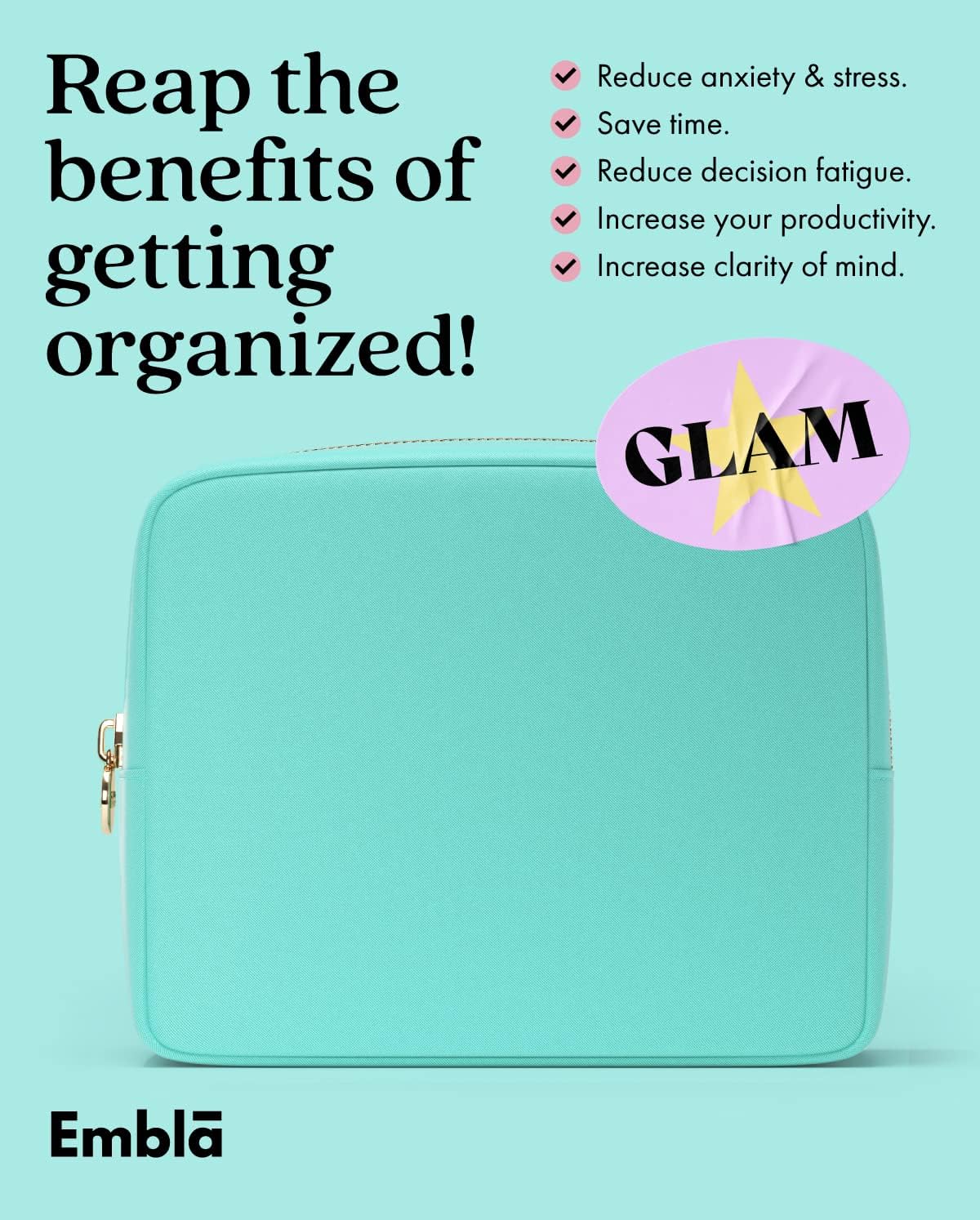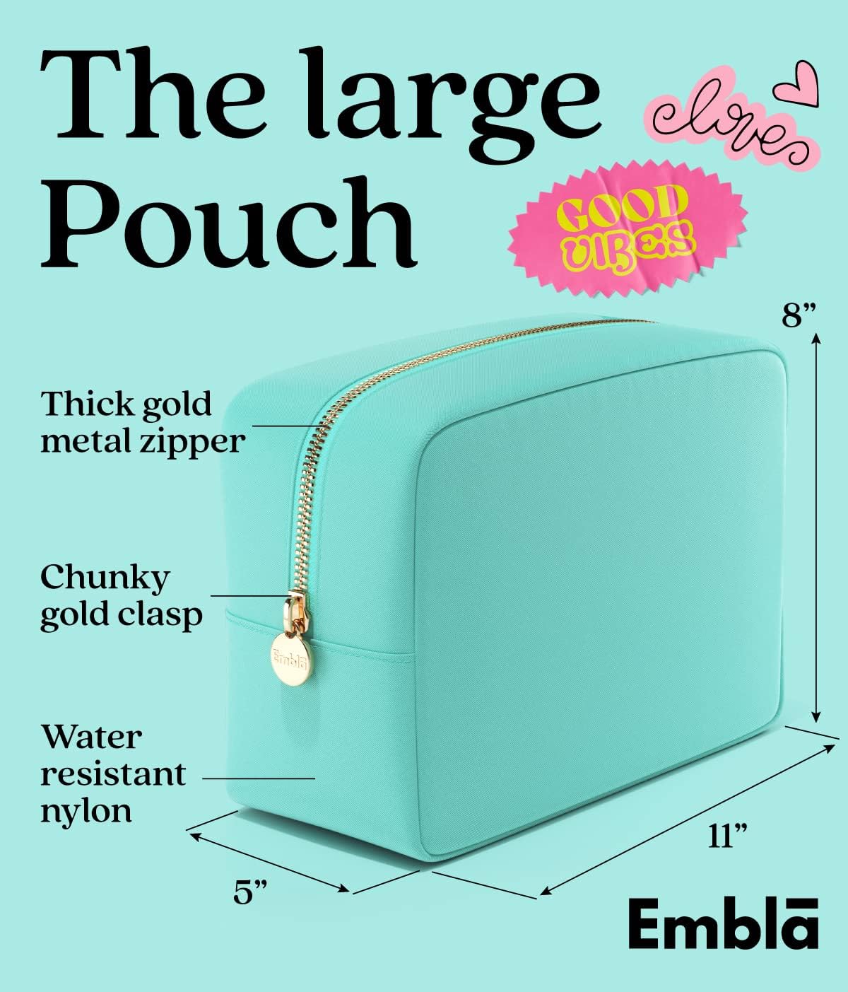 • TRAVEL + CUTE = EMBLA! - Our bags are THE trendy & preppy storage gifts! Simply pick your size (Mini, Large or XL) and start organizing all of your makeup, lipstick, hair stuff, snacks and jewelry accessories! Or use it as a clutch handbag, makeup brush holder, skin care bag, zippered carry case or coin purse wallet!