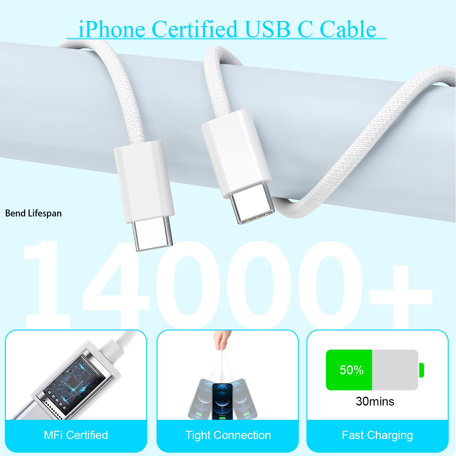 • 【2Pack 20W USB C Charger Fast Charging】The PD 20W iPhone 17 16e 15 Charger USB C Block with 10feet extra long USB C to USB C fast charger cable cord provide Max 20W output power, charge your iPhone 16 15 Pro Max up to 55% in just 30mins, 30% faster than the original 5W USB C charger.