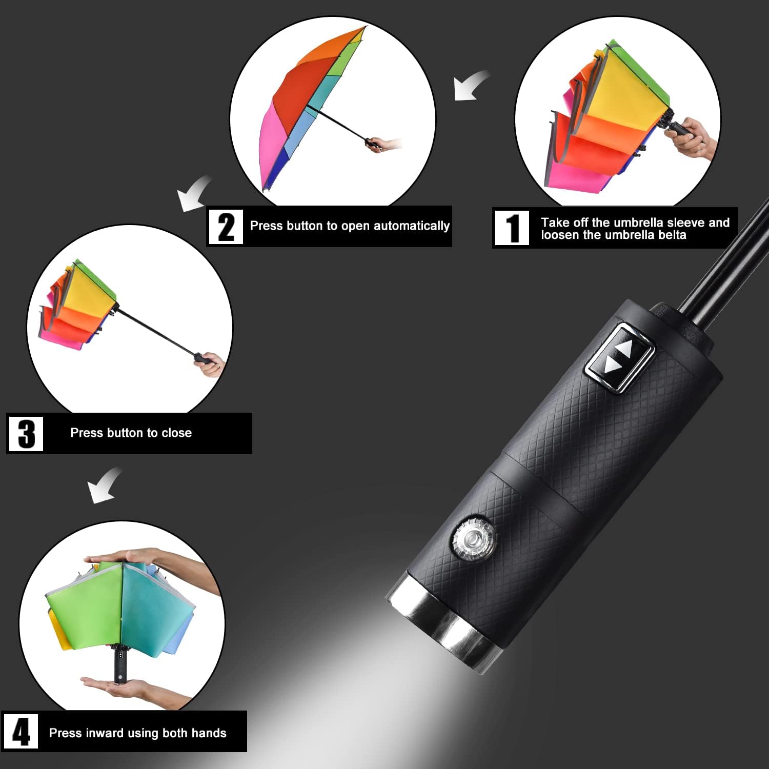 • Auto Open & Close: This folding umbrella with an automatic operation system, opening and closing with just the touch of a button. Avoiding the hassle of manual operation while maintaining compact portability. This umbrella is easy to use for one hand, and the automatic closing function can help you save more time.