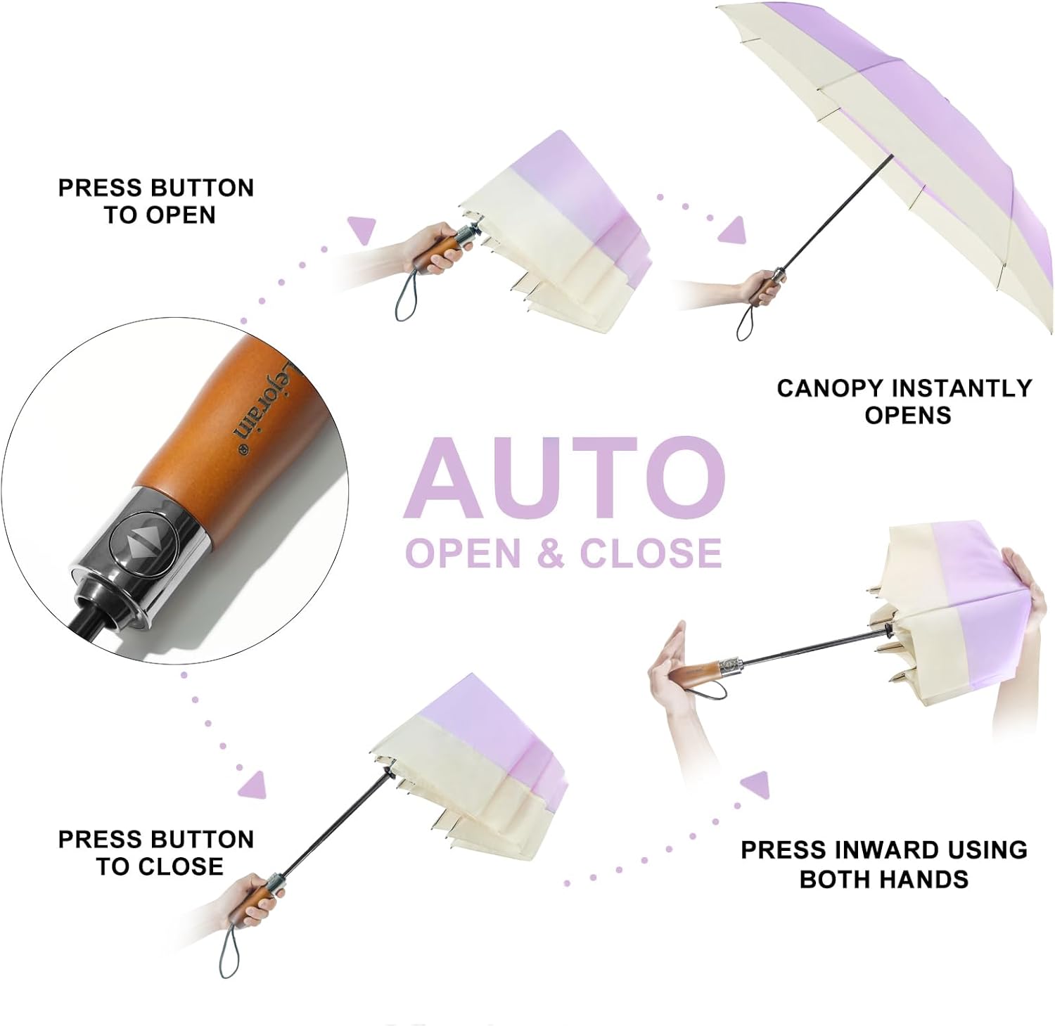 • Auto Open and Close Sturdy Umbrella:The reliable push-button open and close mechanism operates quickly allowing you to open this automatic umbrella in seconds in sudden rain, great for quick entry into a car, building, or tent. Strong umbrella frame not only looks nice, also making it stable and durable in withstand strong wind