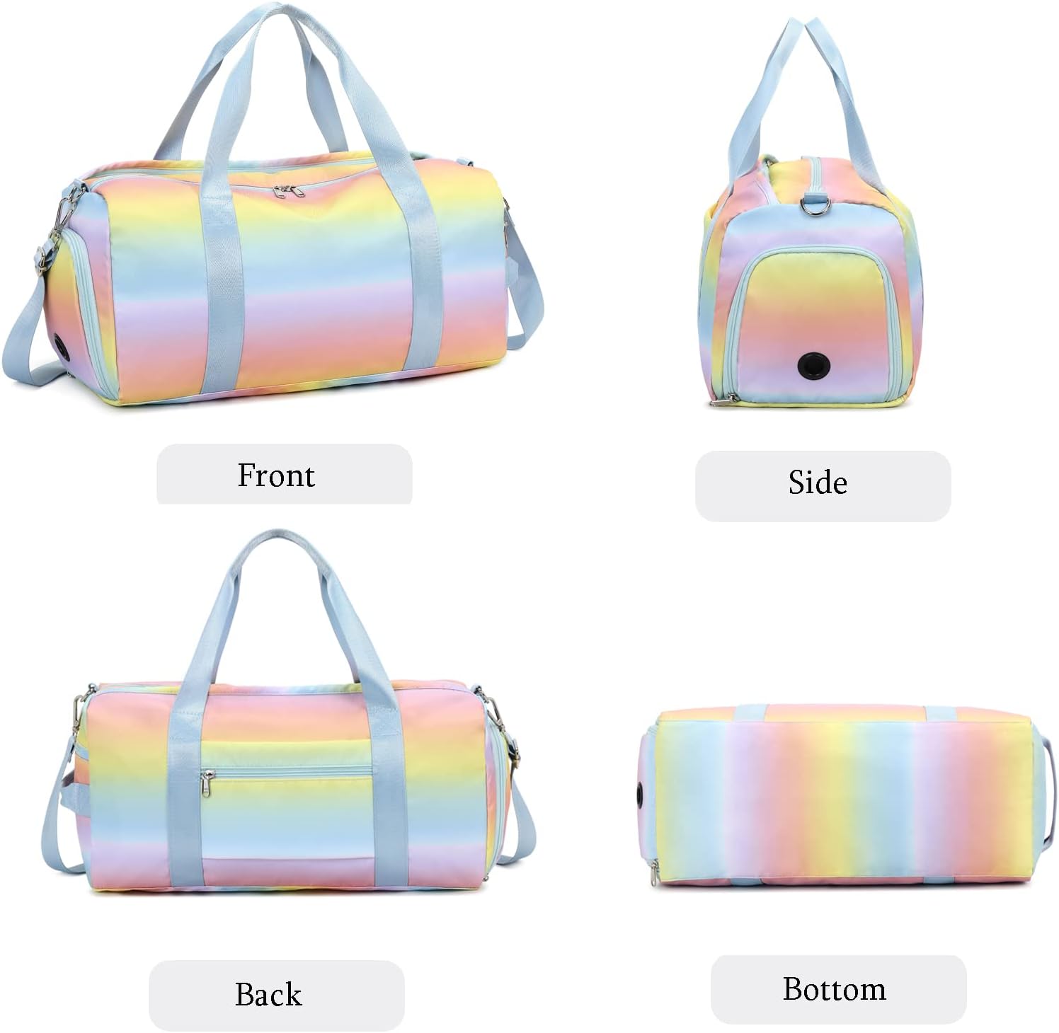 • ✔【Functional Division】Our duffel bag includes 3 main functional partitions.1 large space main pouch,1 fully waterproof wet pocket(for wet swim wear/ sweat gym clothes, socks and towel),1 independent shoe compartment(fit 13' sneakers).