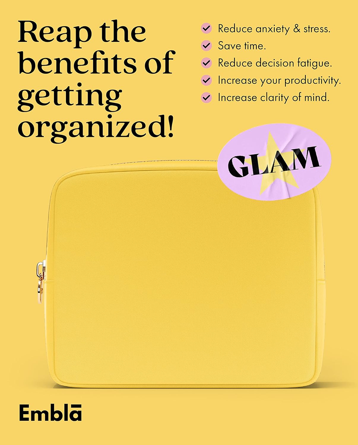 • TRAVEL + CUTE = EMBLA! - Our bags are THE trendy & preppy storage gifts! Simply pick your size (Mini, Large or XL) and start organizing all of your makeup, lipstick, hair stuff, snacks and jewelry accessories! Or use it as a clutch handbag, makeup brush holder, skin care bag, zippered carry case or coin purse wallet!