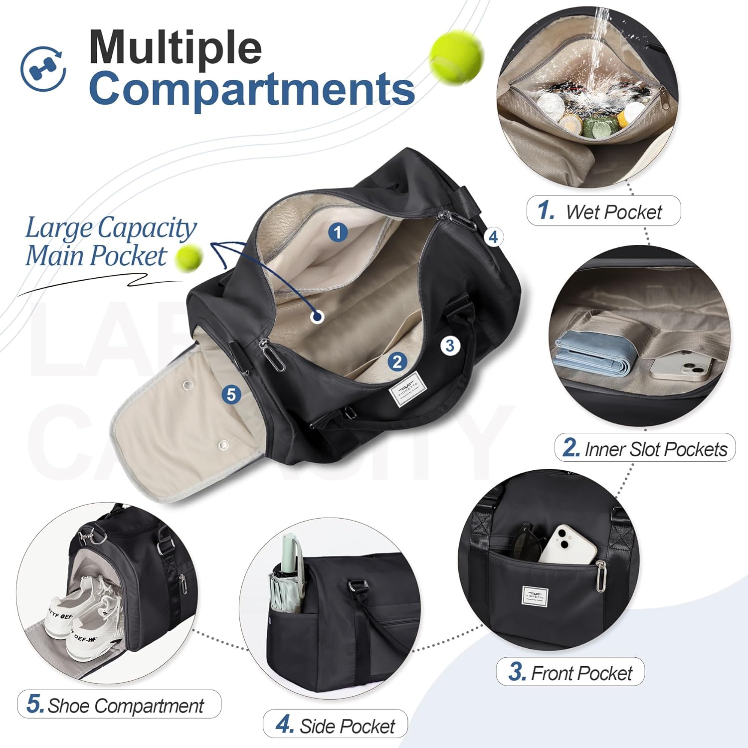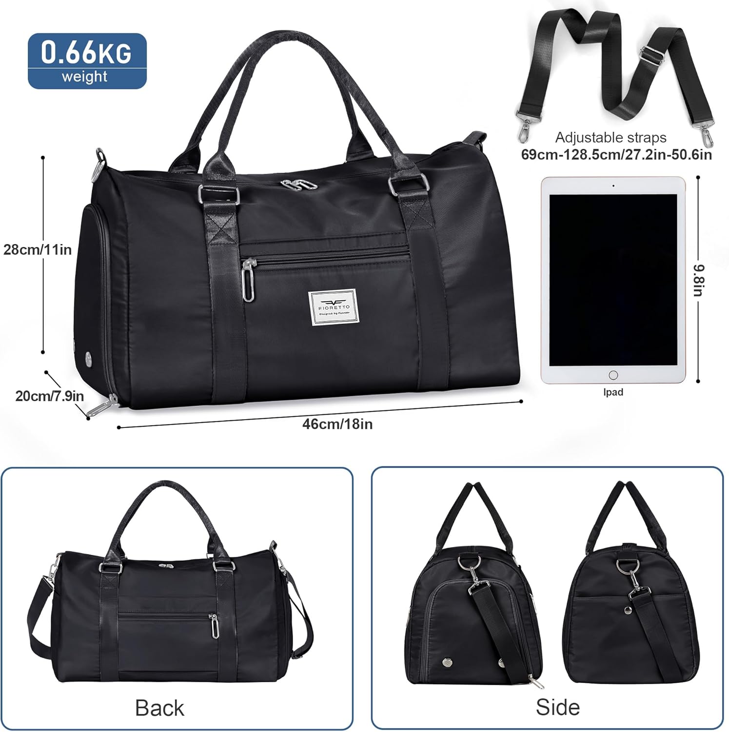 FIORETTO Womens Gym Tote Duffle Bag with Wet Pocket & Shoe Compartment, Sports Duffel Overnight Weekender Hospital Workout Carry on Bag for Girls, Ideal for Travel, Swimming, Dance, Ballet Black