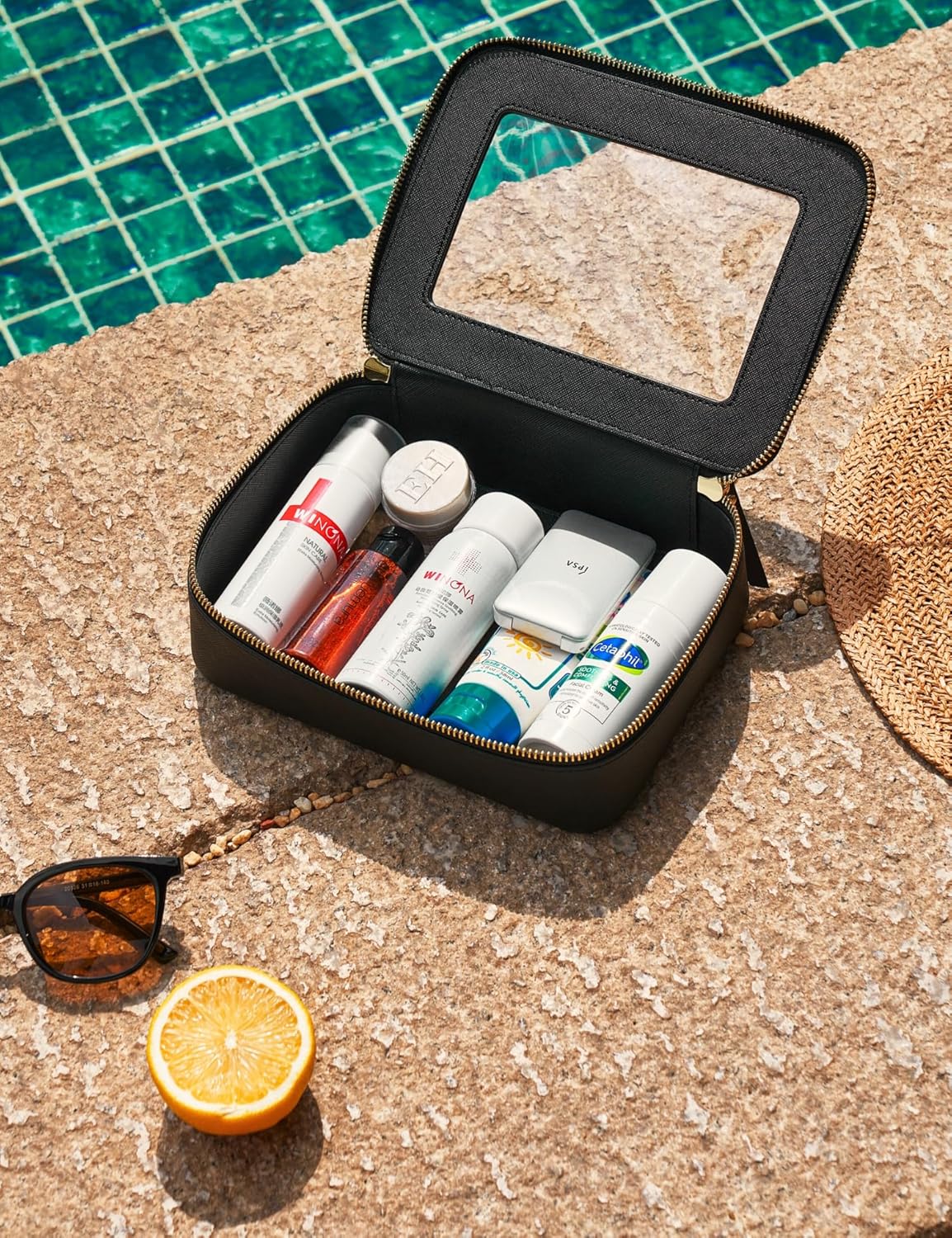 • [Compact and Portable] – The black travel make up bag measures 8.3'' x 6.1'' x 2.4'' (21cm x 15.5cm x 6cm), designed to offer a compact and travel-friendly solution for organizing your makeup and toiletry essentials. It can be easily fit into a variety of bags, whether you prefer to carry it in a handbag, tote, or travel luggage.
