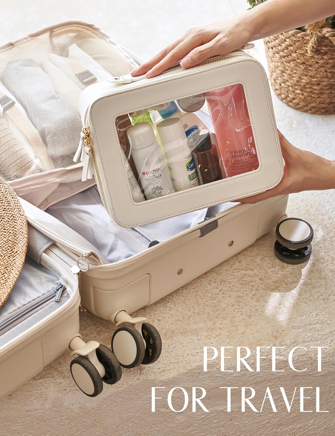 • [Premium Material and Durability] – The clear cosmetic case, both the exterior and interior, is crafted from high-grade saffiano faux leather, which is highly scratch resistant, durable and exceptionally easy to keep clean. It features a smooth zipper for secure closure, and elegant light gold metal hardware accents, adding a luxurious and sophisticated touch to the bag's overall design.