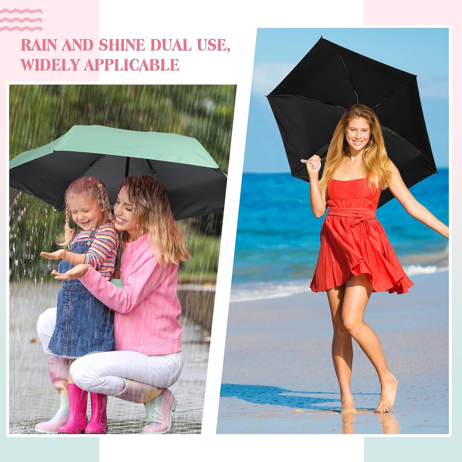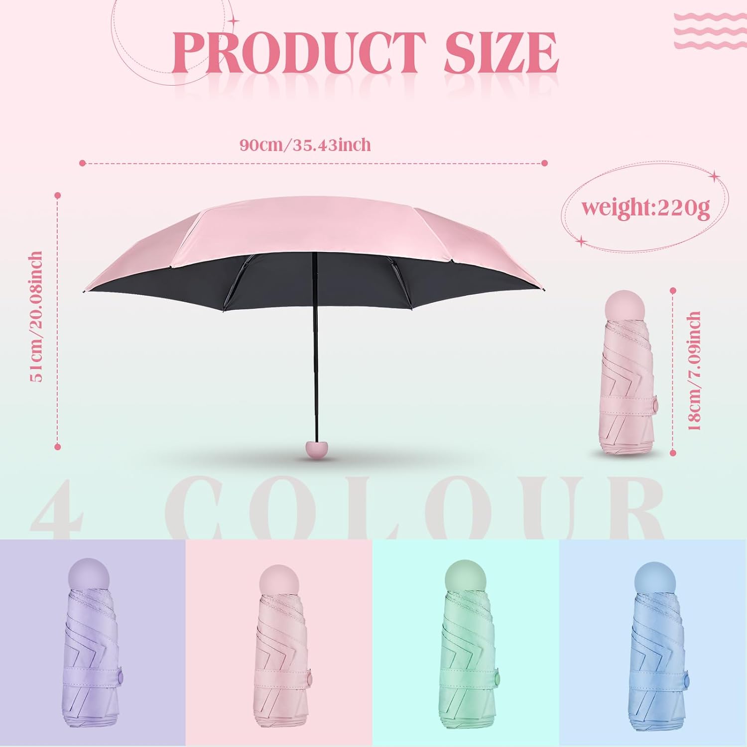 • Lightweight and Portable: the single net weight of this pocket umbrella is about 0.48 lbs, the opened diameter is approx. 35.5 inches, the opened height is approx. 20 inches, the width of the umbrella is approx. 2.36 inches, and the height of the umbrella is approx. 7 inches; This umbrella is a relatively mini size with a five fold and six rib design; The ribs are lightweight and light in texture, can be well stored in backpacks, handbags, purses, and pockets and is convenient to carry