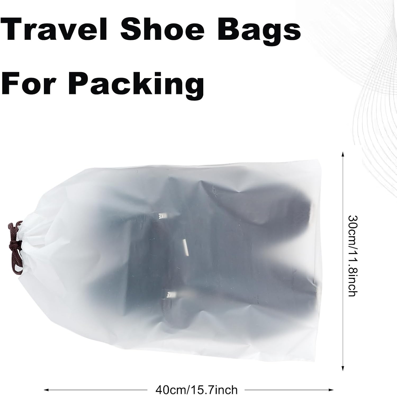 • Quantity and size: 100 pieces of semi transparent drawstring portable waterproof and dustproof storage shoe bag which can meet the packaging and storage needs for travel and home use The size of the shoe bag is 11.8 x 15.7 inches (30 cm x 40 cm)