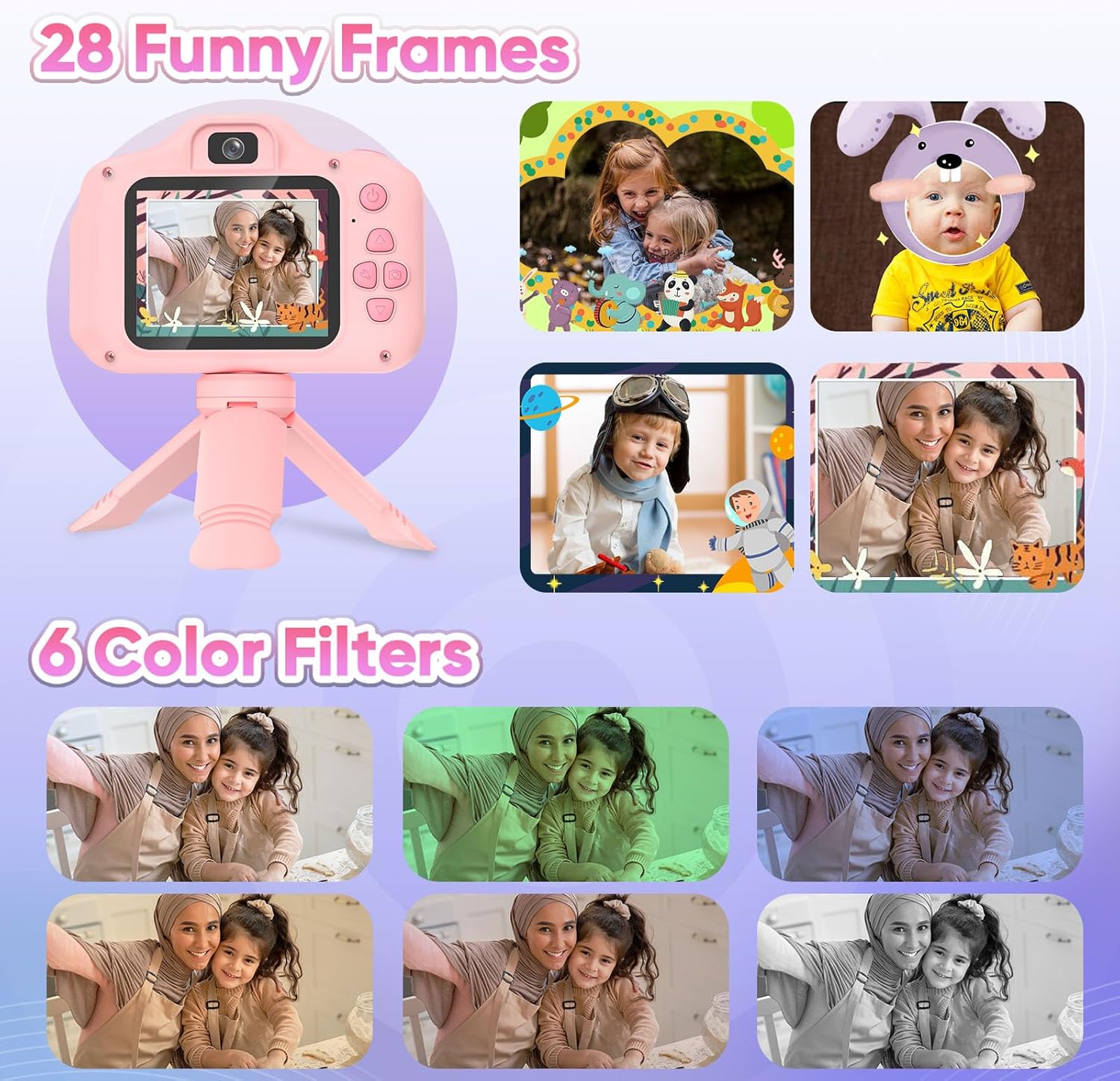 • UPGRADE 10X ZOOM LENS & FLASH: This kids camera is equipped with auto 10x zoom rotation lens, 8.0MP and 1080P Video. Greatly improved the definition of photos . The flash design on the top allows you to accurately capture happy moments even in the dark. With Big head sticker shooting, children can take photos with frames, leave some hilarious photos with family or friends