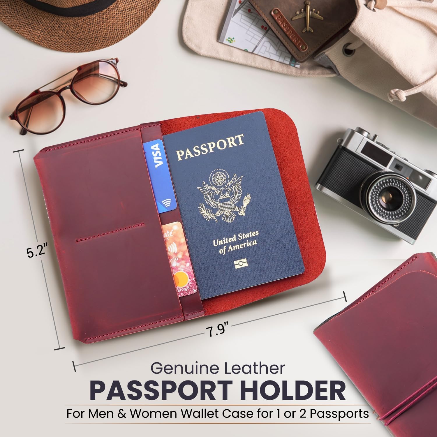 Leather Passport Holder with Travel Wallet, Genuine Leather Passport Cover- Passport Wallet, Leather Folding Wallet for Passports (Strap, Red)