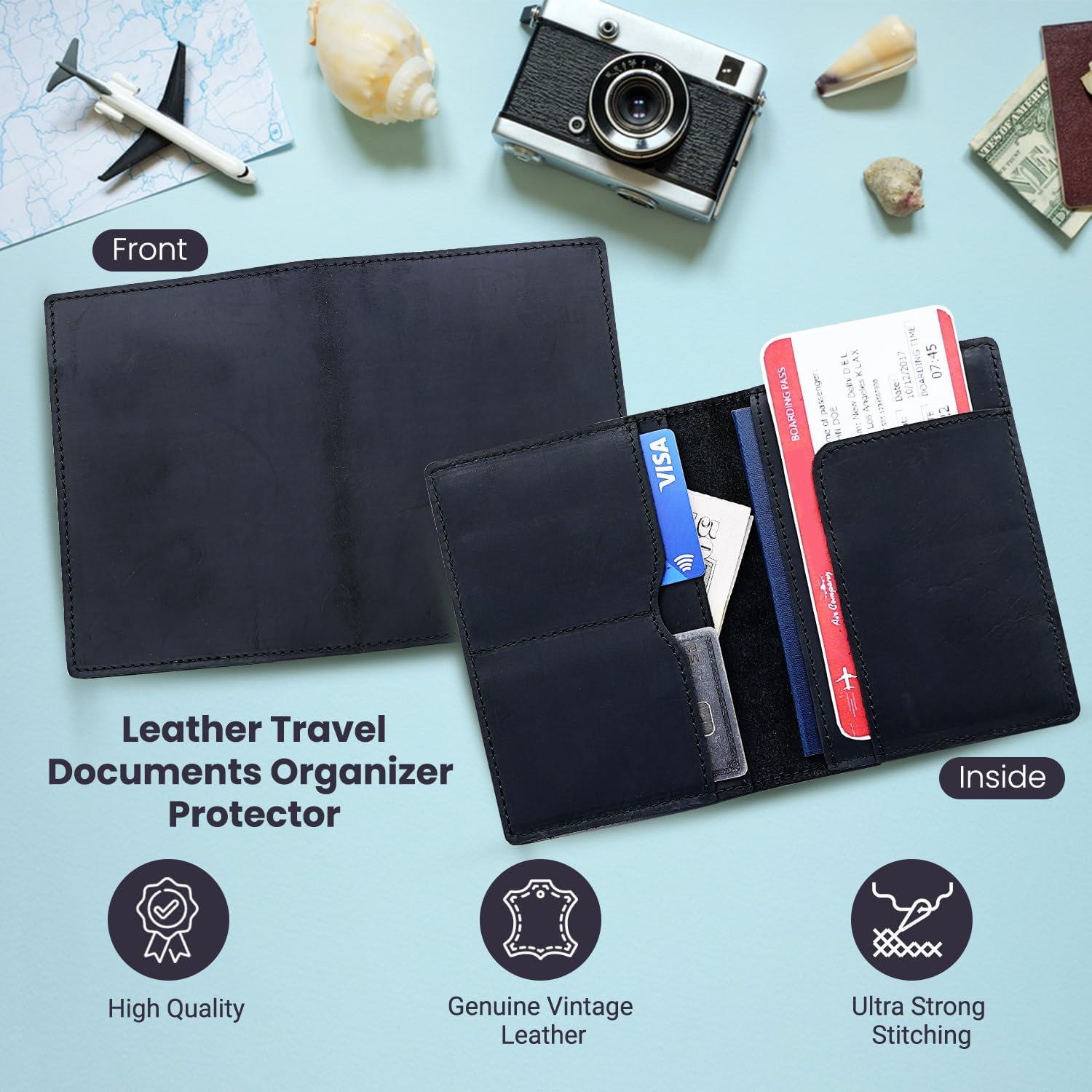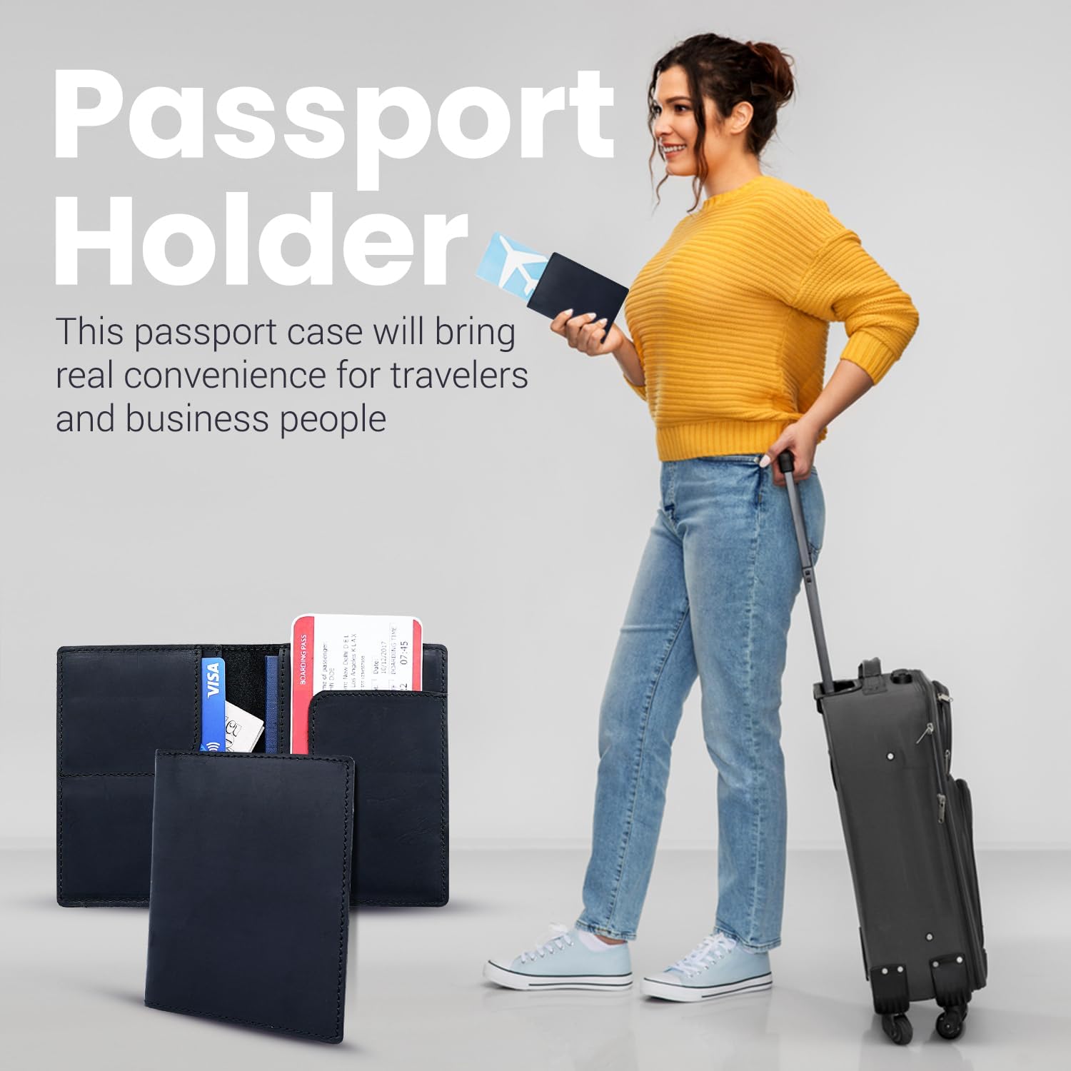 Leather Passport Holder with Travel Wallet, Genuine Leather Passport Cover- Passport Wallet, Leather Folding Wallet for Passports (Straight Cut, Black)