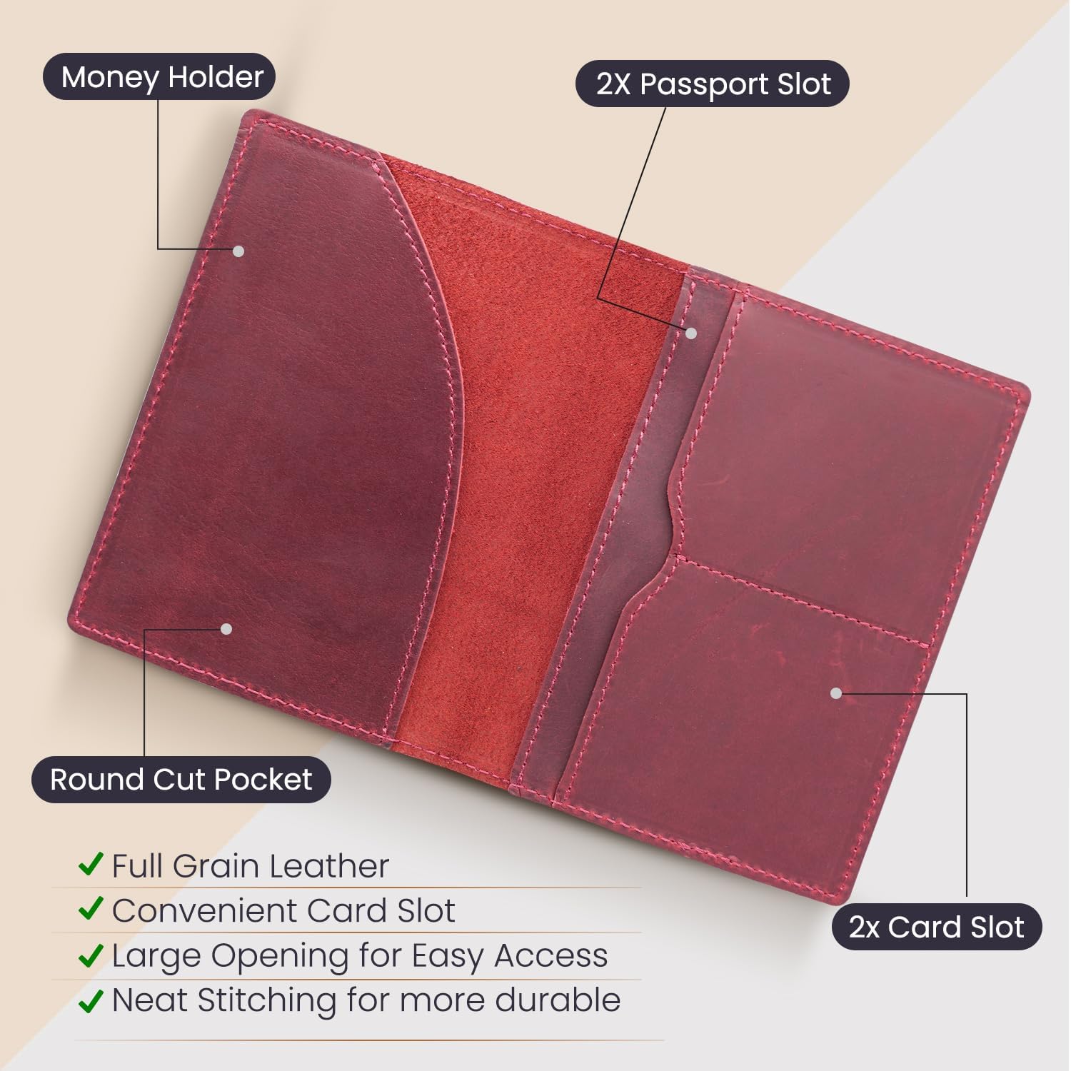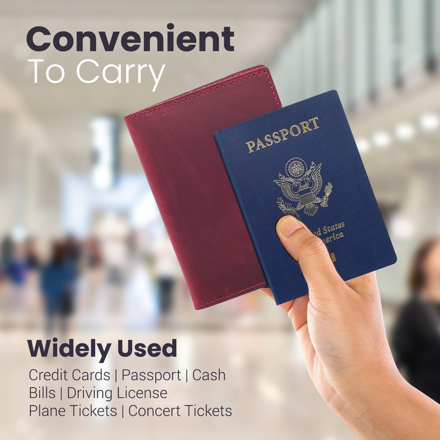 Leather Passport Holder with Travel Wallet, Genuine Leather Passport Cover- Passport Wallet, Leather Folding Wallet for Passports (Oval Cut, Red)