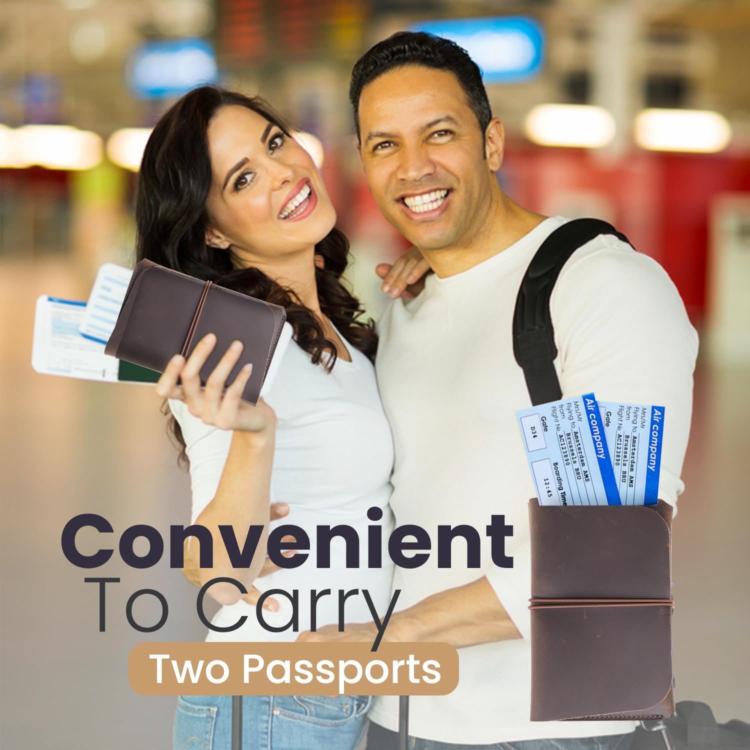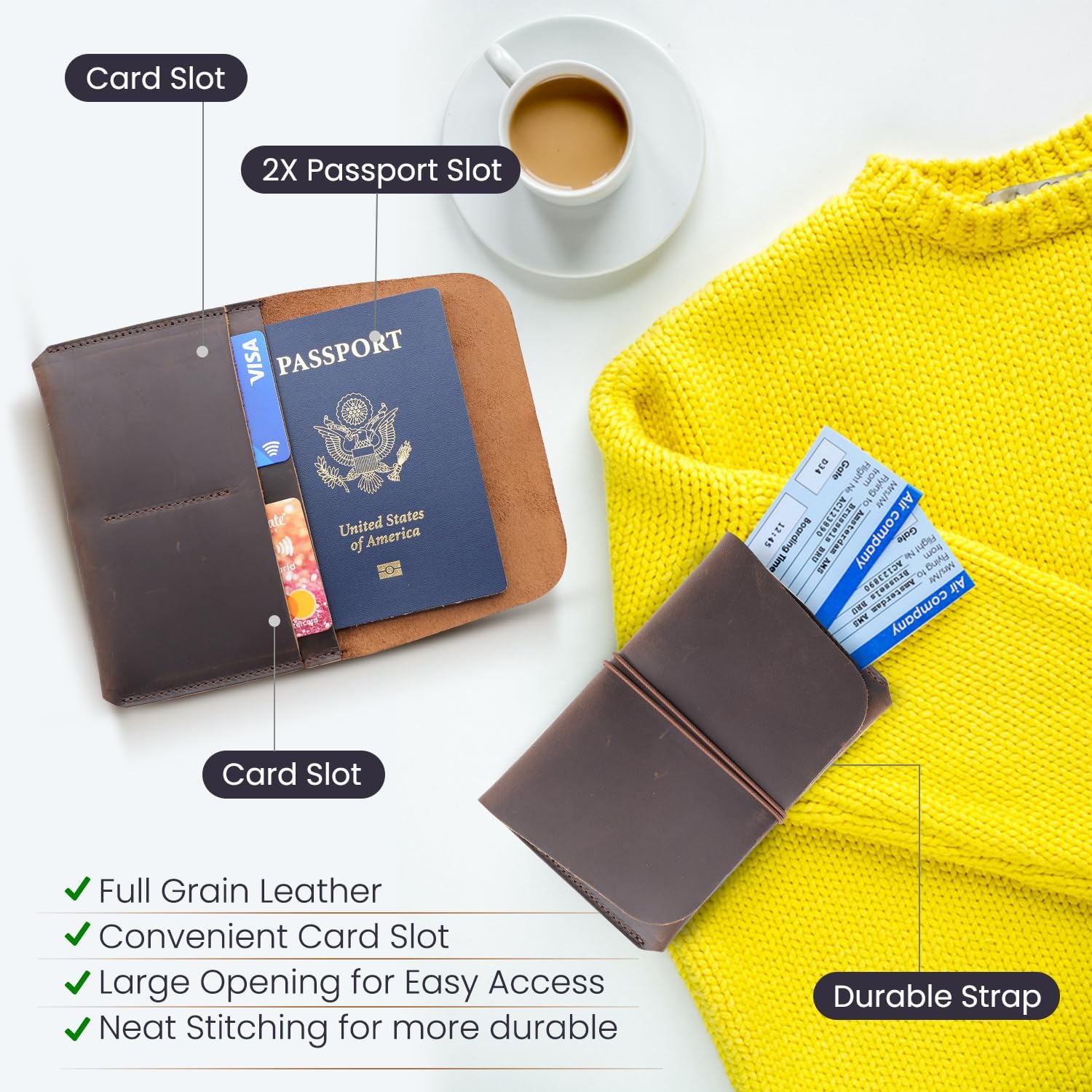 Leather Passport Holder with Travel Wallet, Genuine Leather Passport Cover- Passport Wallet, Leather Folding Wallet for Passports (Strap, Dark Brown)