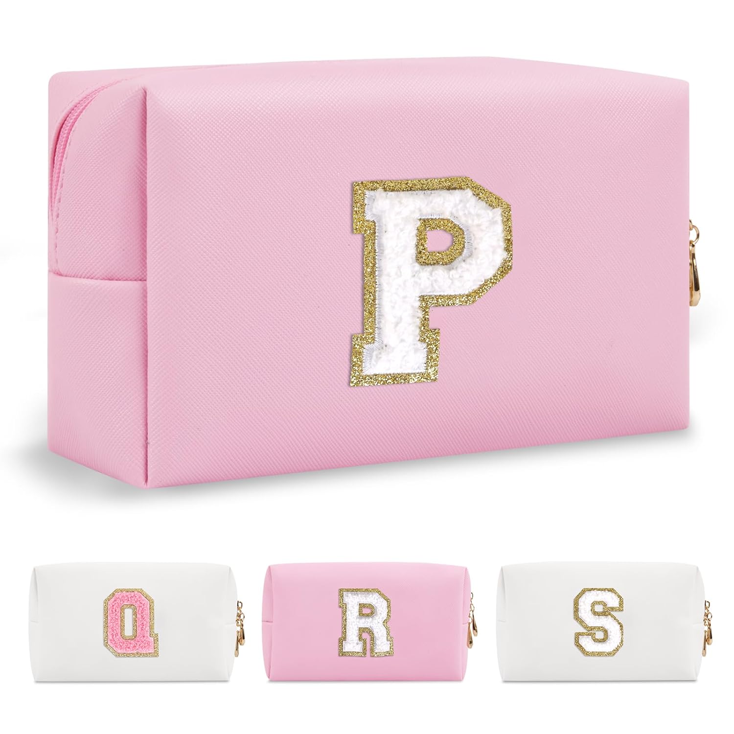 Personalized Initial A-Z Preppy Patch Makeup Bag,Small PU Chenille Letter Cosmetic Bag with Zipper for Teen Girls,Pink Cute Toiletry Organizer Bag,Monogram Makeup Case Gift for Women Girls,Letter P