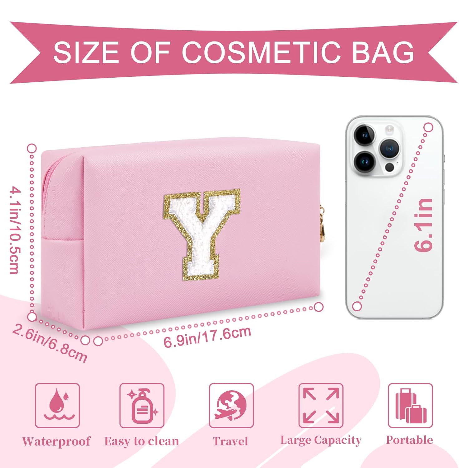 Personalized Initial A-Z Preppy Patch Makeup Bag,Small PU Chenille Letter Cosmetic Bag with Zipper for Teen Girls,Pink Cute Toiletry Organizer Bag,Monogram Makeup Case Gift for Women Girls,Letter Y