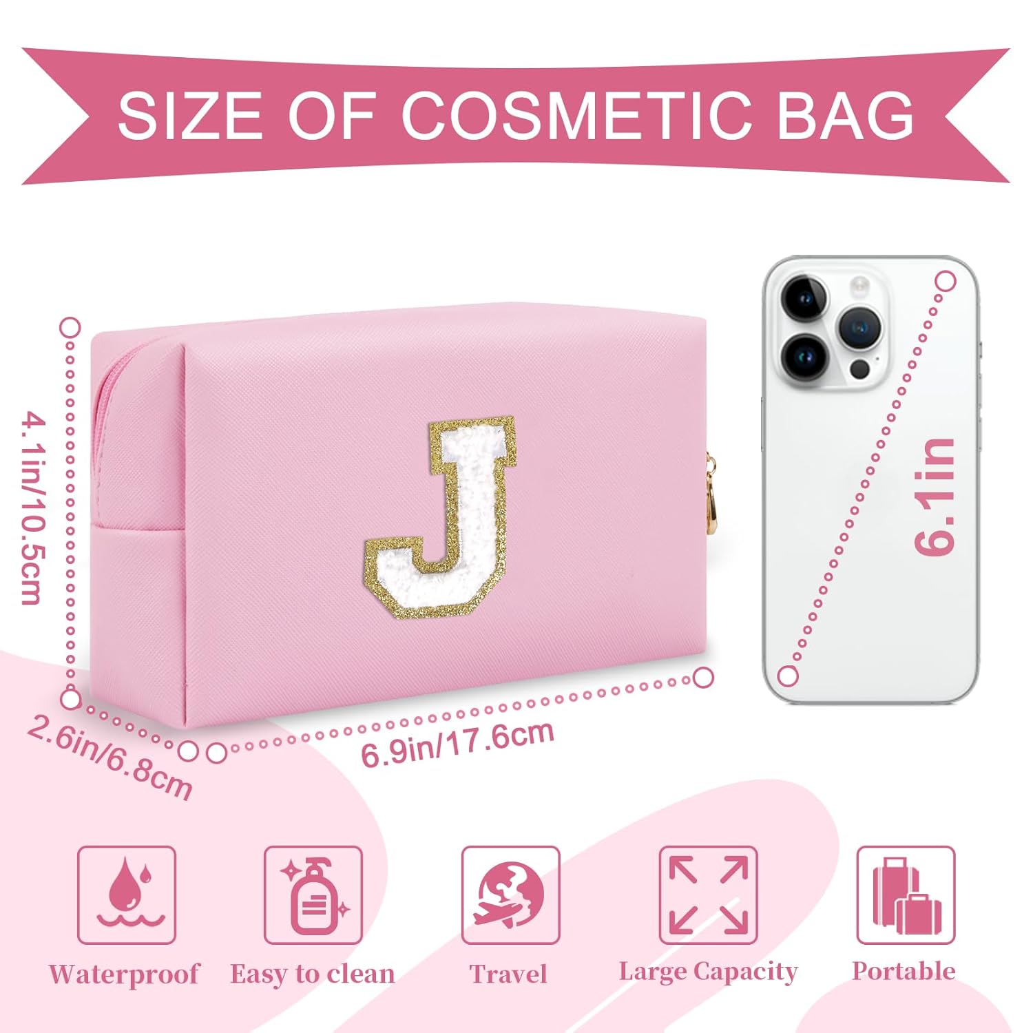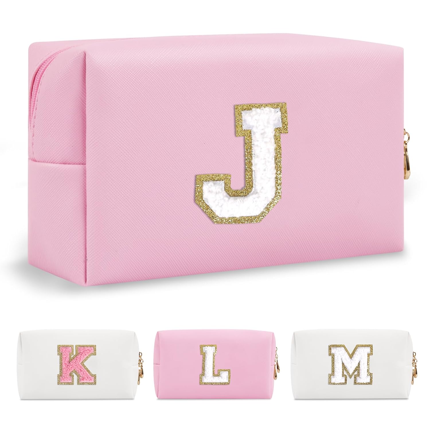 Personalized Initial A-Z Preppy Patch Makeup Bag,Small PU Chenille Letter Cosmetic Bag with Zipper for Teen Girls,Pink Cute Toiletry Organizer Bag,Monogram Makeup Case Gift for Women Girls,Letter J