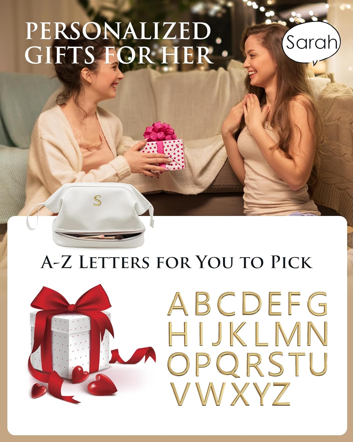 Monogrammed Gift for Women Girls, Initial Makeup Bag, Personalized Double Layer Cosmetic Bag with Makeup Brush Organizer, Large Capacity PU Leather Travel Toiletry Bag, Sister Gifts