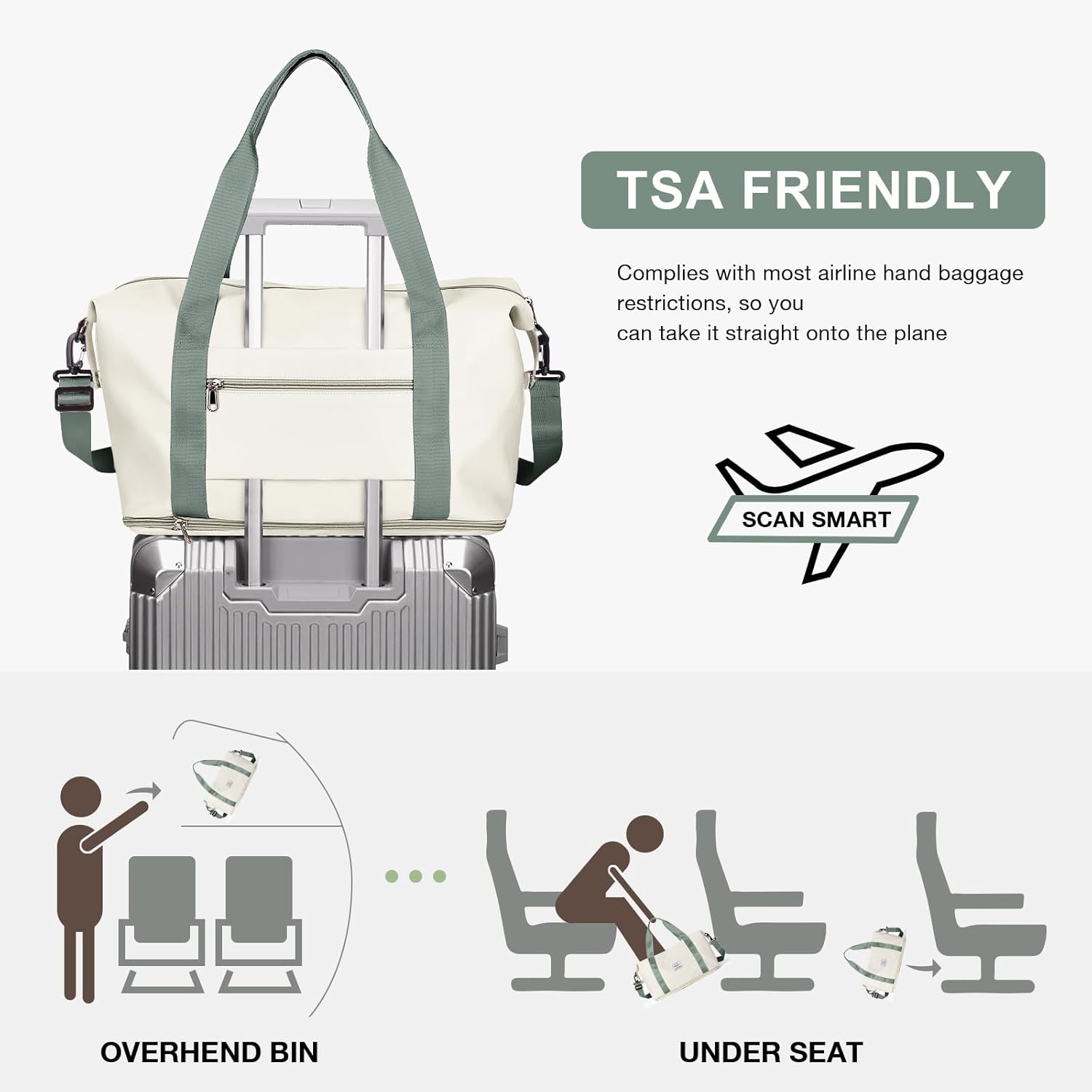 • 【High Capacity Travel Bag】Travel Bag has three multiple internal and four external organizational pockets,which ensure you placed more scientifically and orderly.The overnight bag for women has Large Capacity.Ordinary size :41*26*22CM,Expansion Dimension:41*37*22CM.You can carry it onto an airplane. Large storage space for a clothes for short trip.It has a capacity of 35L and can hold 6 to 8 pieces of summer clothes,Cosmetics,toiletries,wallets,keys,earphones,mobile power,mobile phones,files.