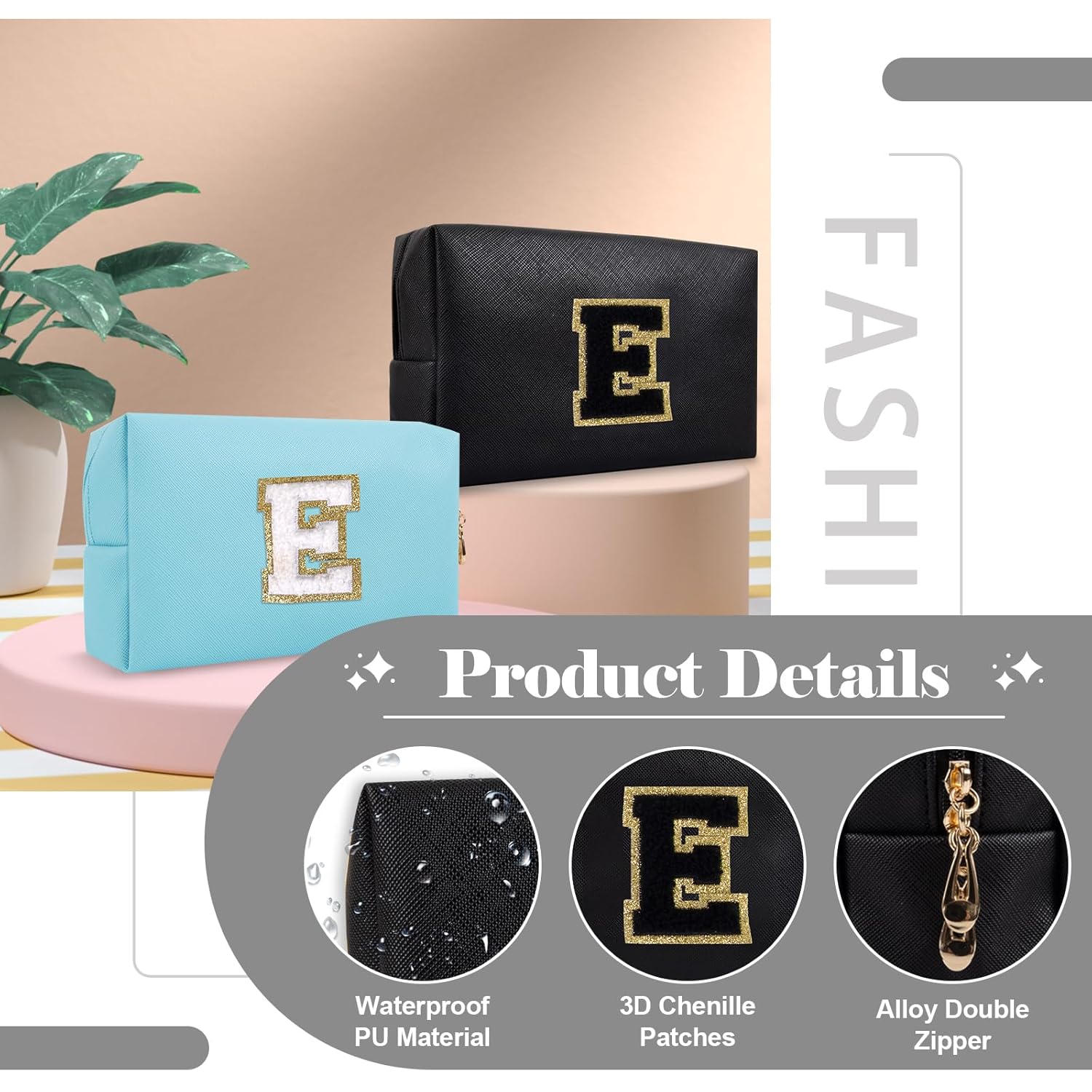 • 🏶【 Unique Design 】Preppy cosmetic bag with golden glittering chenille patch, fashionable and skin-friendly, comfortable to the touch. The cute letter pattern patch has a strong personalized style, which is sewn on this cosmetic bag, making the storage bag more eye-catching and adding a personalized atmosphere.