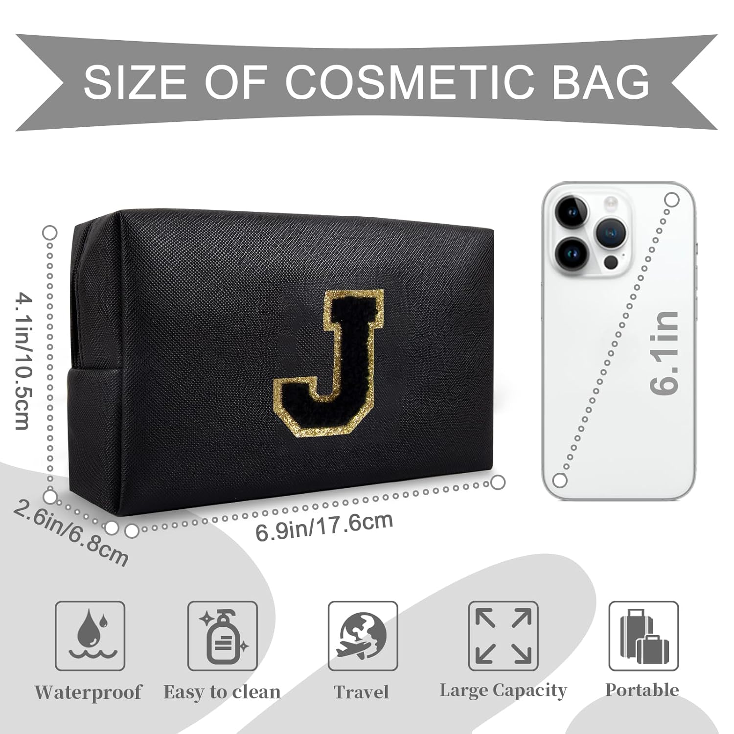 Personalized Initial A-Z Preppy Patch Makeup Bag,Small PU Chenille Letter Cosmetic Bag with Zipper for Teen Girls,Black Cute Toiletry Organizer Bag,Monogram Makeup Case Gift for Women Girls,Letter J