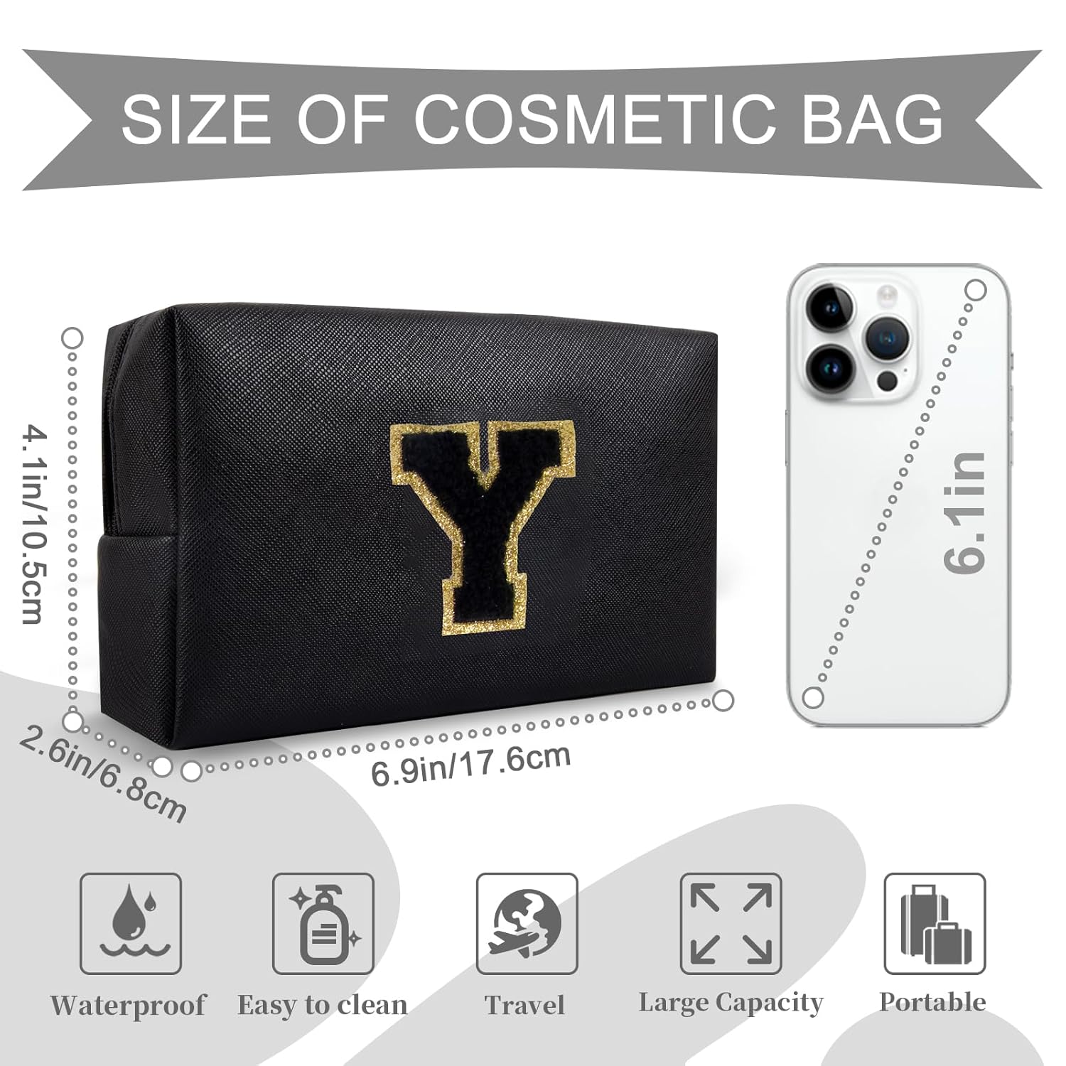 Personalized Initial A-Z Preppy Patch Makeup Bag,Small PU Chenille Letter Cosmetic Bag with Zipper for Teen Girls,Black Cute Toiletry Organizer Bag,Monogram Makeup Case Gift for Women Girls,Letter Y