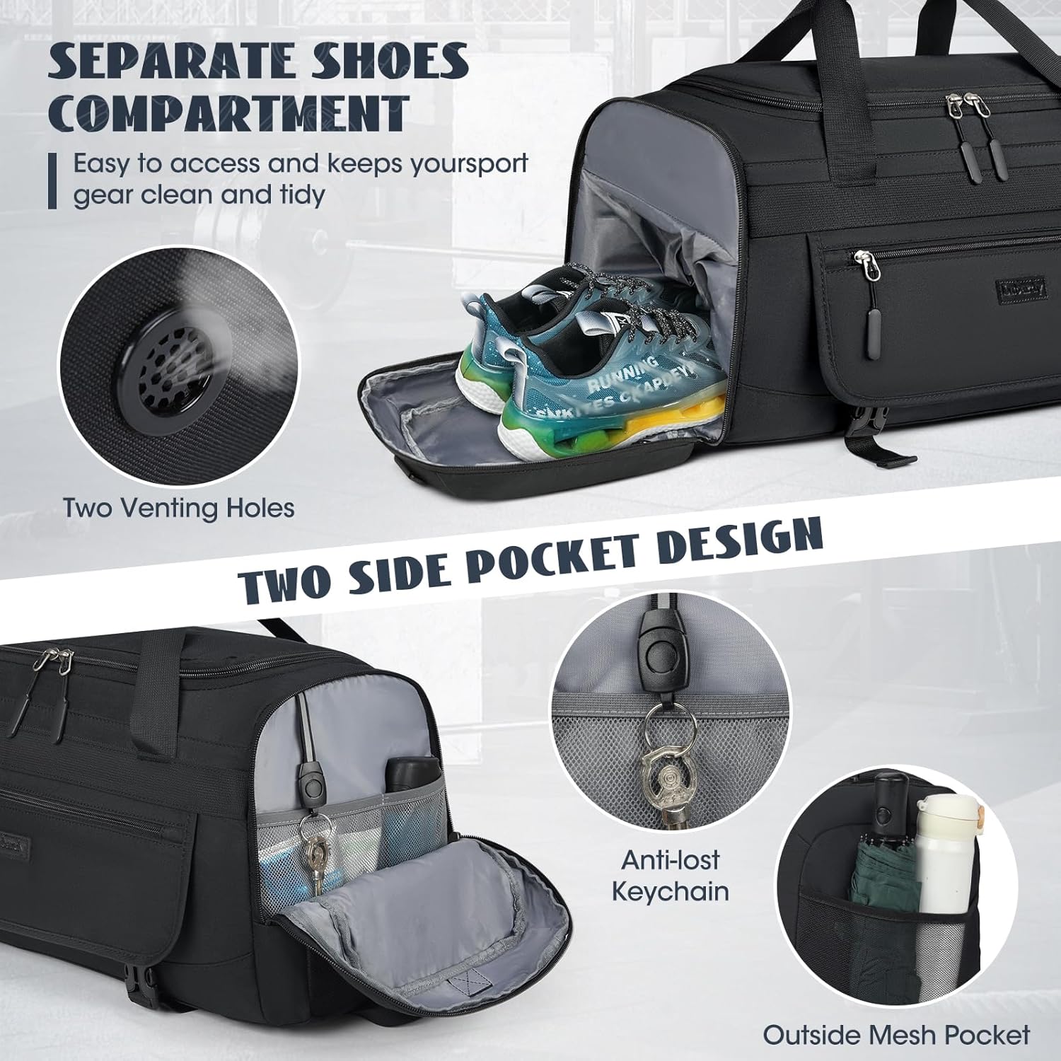 IGOLUMON Gym Bag for Men 55L Sports Duffel Bags Gym Duffle Bag Women with Shoe Compartment & Wet Pocket Water Resistant Travel Duffel Bag Lightweight Weekender Overnight Bag Black