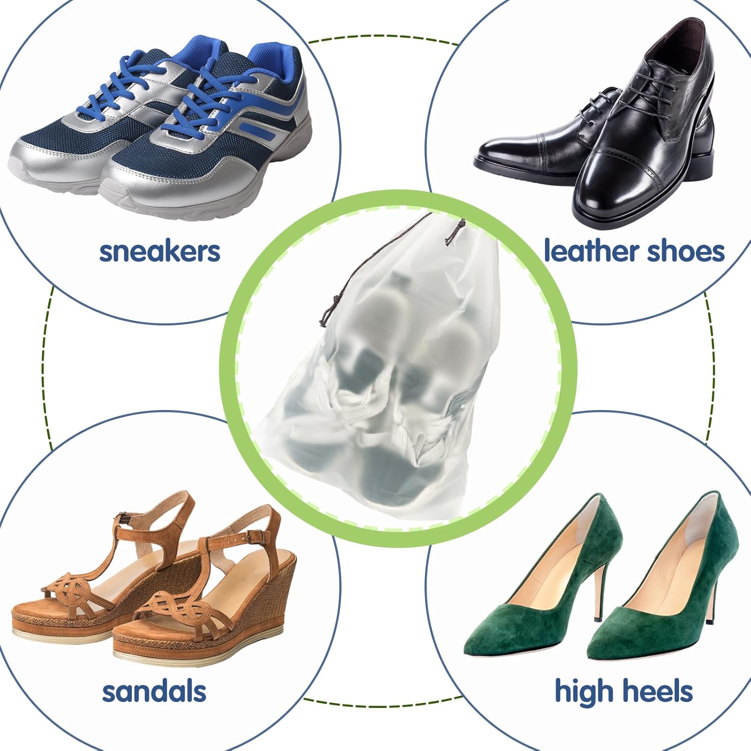 • Practical Design:The transparent appearance allows for easy and quick identification of the contents of the bag.The storage bag with drawstring design helps to keep shoes clean and tidy for orderly storage.