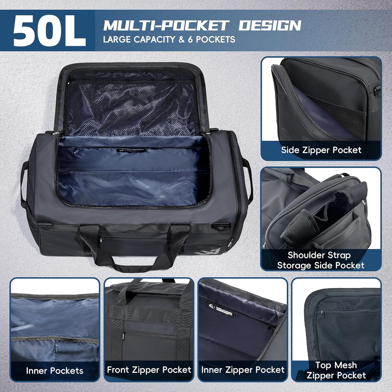 • [Large Capacity Duffel Bag] Measuring 23.6"L X 11.5"W X 11.8"H with 50L Capacity, enough room for your sports gears ,basketball, football and traveling necessities. It features 4 internal pockets,including 2 inner pockets, 1 zipper pocket and 1 mesh zipper pocket on top to separate small accessories, it fits for 3-5 days travel/adventure, or for more bulky sports gears, Note: The bag is made of heavy duty material, not suitable for traveling light