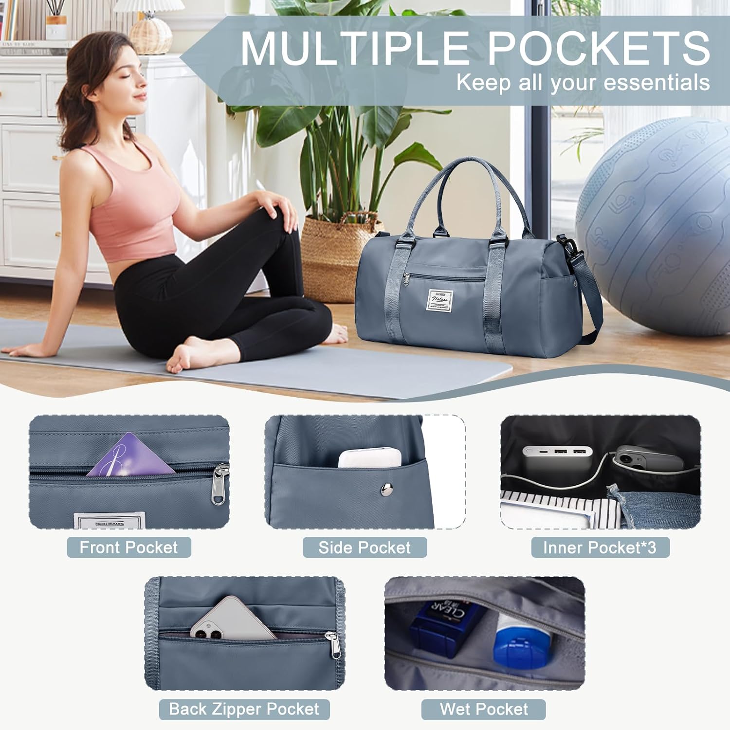 Gym Bag for Women with Shoes Compartment Small Duffel Bag Sport bag with Toiletry Bag Overnight Travel Tote Bags Weekender Carry on Bag Personal Item Bags for Airlines Grey Blue