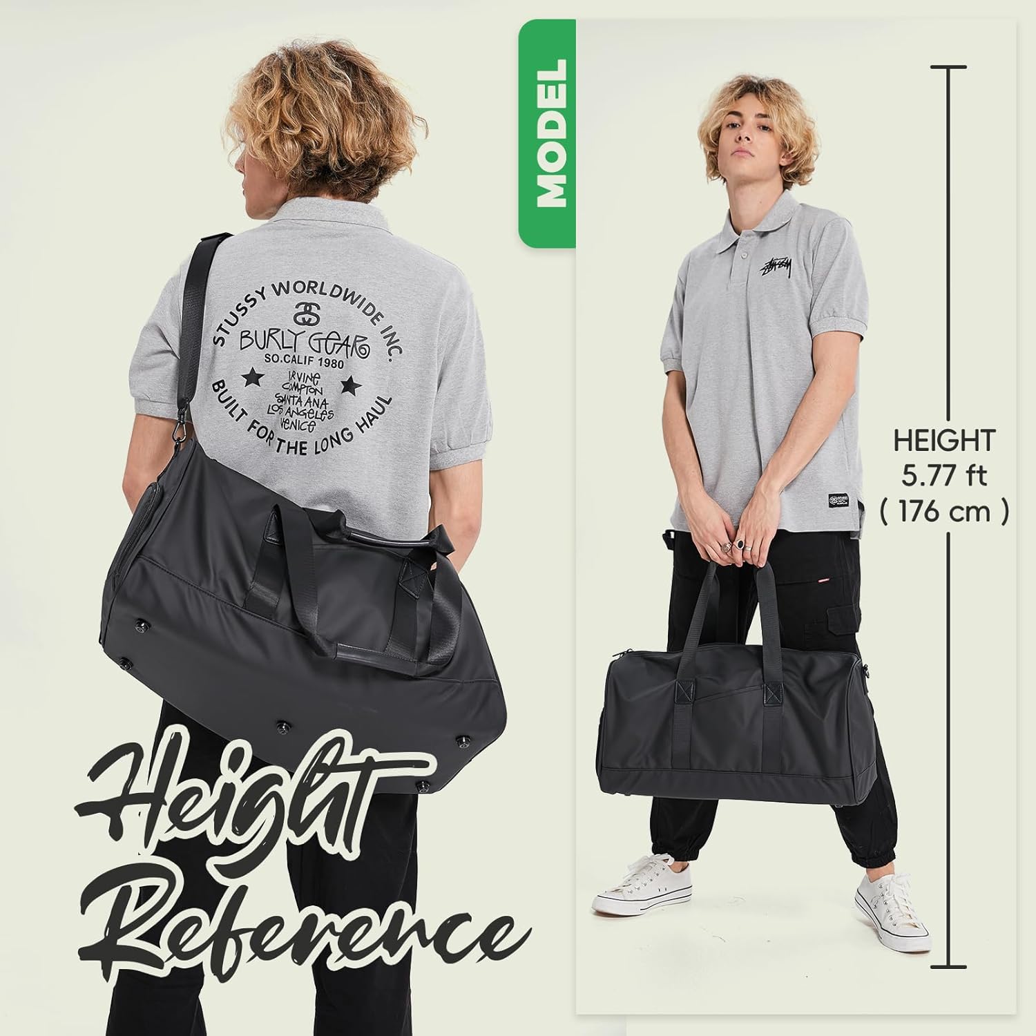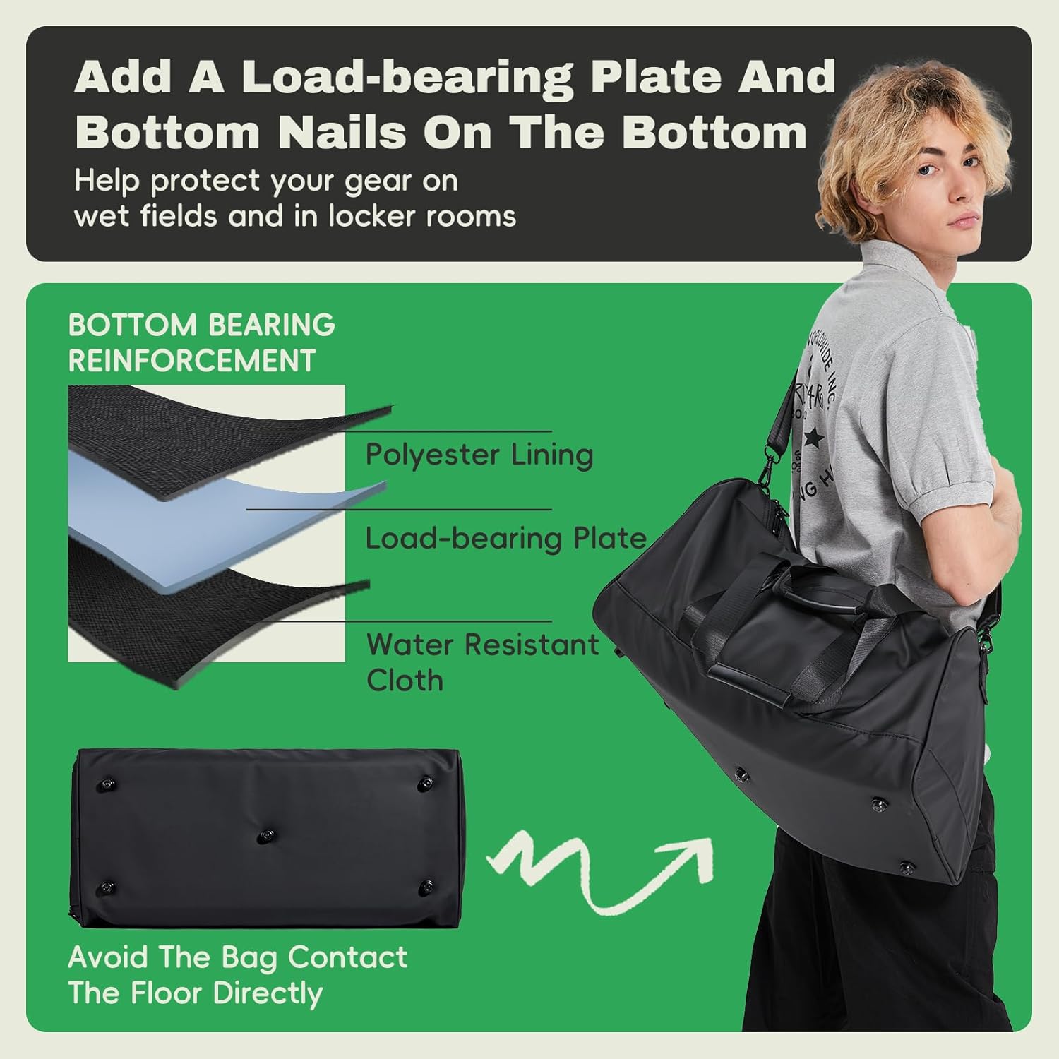 • [Premium Material] This mens gym bag is made of premium durable water resistant fabric, it is soft and thickened, the lining with good breathability. This waterproof duffle bag just clean with a dry or wet cloth wipe