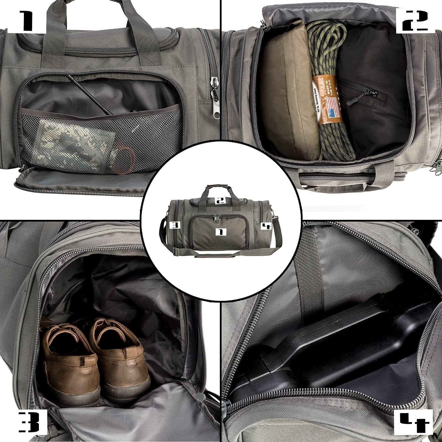 • 【Multipurpose Tactical Duffle Bag】There are 4 main loading spaces that provides secure storage for dry & clean clothes or everything for gym & traveling you necessary.two zipper side pockets feature multiple storage compartment for phone, keys & iPad. Front zipper pocket with mesh pocket inside for other small items.